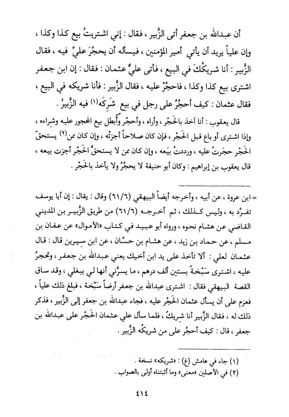 أَنَّ عَبْدَ اللَّهِ بْنَ جَعْفَرٍ أَتَى الزُّبَيْرَ فَقَالَ: إِنِّي اشْتَرَيْتُ بَيْعَ كَذَا وَكَذَا وَإِنَّ عَلِيًّا يُرِيدُ أَنْ يَأْتِيَ أَمِيرَ الْمُؤْمِنِينَ فَيَسْأَلَهُ أَنْ يَحْجُرَ عَلَيَّ فِيهِ , فَقَالَ الزُّبَيْرُ: فَأَنَا شَرِيكُكَ فِي الْبَيْعِ , فَأَتَى عَلِيُّ عُثْمَانَ , فَقَالَ: إِنَّ ابْنَ جَعْفَرٍ اشْتَرَى بَيْعَ كَذَا وَكَذَا فَاحْجُرْ عَلَيْهِ , فَقَالَ الزُّبَيْرُ: أَنَا شَرِيكُهُ فِي الْبَيْعِ , فَقَالَ عُثْمَانُ: §" كَيْفَ أَحْجُرُ عَلَى رَجُلٍ فِي بَيْعٍ شَرِيكُهُ فِيهِ الزُّبَيْرُ؟. قَالَ يَعْقُوبُ: أنا آخُذُ بِالْحَجْرِ وَأُرَاهُ , وَأَحْجُرُ وَأُبْطِلُ بَيْعَ الْمَحْجُورِ عَلَيْهِ وَشِرَاءَهُ , وَإِذَا اشْتَرَى أَوْ بَاعَ قَبْلَ الْحَجْرِ فَإِنْ كَانَ صَلَاحًا أَجَزْتُهُ وَإِنْ كَانَ مَعْنًى يَسْتَحِقُّ الْحَجْرَ حَجَرْتُ عَلَيْهِ وَرَدَدْتُ عَلَيْهِ بَيْعَهُ وَإِنْ كَانَ مِمَّنْ لَا يَسْتَحِقُّ الْحَجْرَ عَلَيْهِ أَجَزْتُ بَيْعَهُ. قَالَ يَعْقُوبُ بْنُ إِبْرَاهِيمَ: وَكَانَ أَبُو حَنِيفَةَ لَا يَحْجُرُ وَلَا يَأْخُذُ بِالْحَجْرِ