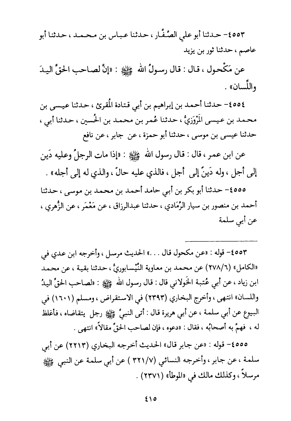 4553 - نا أَبُو عَلِيٍّ الصَّفَّارُ , نا عَبَّاسُ بْنُ مُحَمَّدٍ , نا أَبُو عَاصِمٍ , نا ثَوْرُ بْنُ يَزِيدَ , عَنْ مَكْحُولٍ , قَالَ: قَالَ رَسُولُ اللَّهِ صَلَّى اللهُ عَلَيْهِ وَسَلَّمَ: § «إِنَّ لِصَاحِبِ الْحَقِّ الْيَدَ وَاللِّسَانَ»