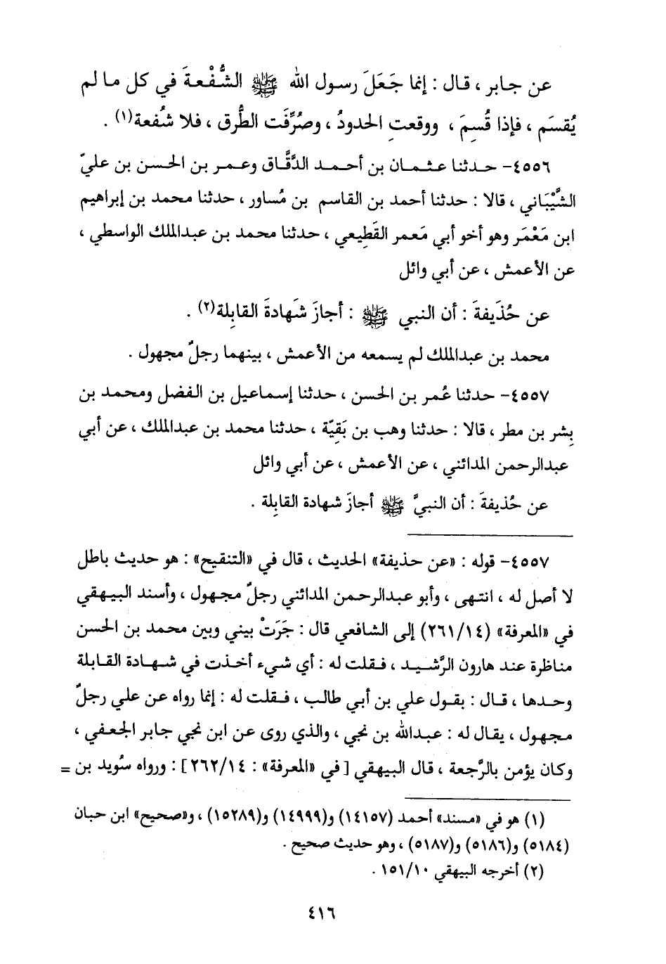 4556 - نا عُثْمَانُ بْنُ أَحْمَدَ الدَّقَّاقُ , وَعُمَرُ بْنُ الْحَسَنِ بْنِ عَلِيٍّ الشَّيْبَانِيُّ , قَالَا: نا أَحْمَدُ بْنُ الْقَاسِمِ بْنِ مُسَاوِرٍ , نا مُحَمَّدُ بْنُ إِبْرَاهِيمَ بْنِ مَعْمَرٍ هُوَ ابْنُ أَخِي أَبِي مَعْمَرٍ الْقَطِيعِيِّ , نا مُحَمَّدُ بْنُ عَبْدِ الْمَلِكِ الْوَاسِطِيُّ , عَنِ الْأَعْمَشِ , عَنْ أَبِي وَائِلٍ , عَنْ حُذَيْفَةَ , أَنَّ النَّبِيَّ صَلَّى اللهُ عَلَيْهِ وَسَلَّمَ § «أَجَازَ شَهَادَةَ الْقَابِلَةِ». مُحَمَّدُ بْنُ عَبْدِ الْمَلِكِ لَمْ يَسْمَعْهُ مِنَ الْأَعْمَشِ بَيْنَهُمَا رَجُلٌ مَجْهُولٌ