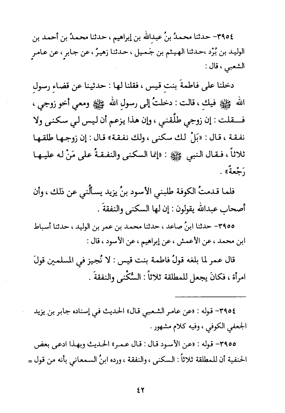3954 - نا مُحَمَّدُ بْنُ عَبْدِ اللَّهِ بْنِ إِبْرَاهِيمَ , نا مُحَمَّدُ بْنُ أَحْمَدَ بْنِ الْوَلِيدِ بْنِ بُرْدٍ , نا الْهَيْثَمُ بْنُ جَمِيلٍ , نا زُهَيْرٌ , عَنْ جَابِرٍ , عَنْ عَامِرٍ الشَّعْبِيِّ , قَالَ: دَخَلْنَا عَلَى فَاطِمَةَ بِنْتِ قَيْسٍ فَقُلْنَا لَهَا: حَدِّثِينَا عَنْ قَضَاءِ رَسُولِ اللَّهِ صَلَّى اللهُ عَلَيْهِ وَسَلَّمَ فِيكِ , قَالَتْ: دَخَلْتُ إِلَى رَسُولِ اللَّهِ صَلَّى اللهُ عَلَيْهِ وَسَلَّمَ وَمَعِي أَخُو زَوْجِي , فَقُلْتُ: إِنَّ زَوْجِي طَلَّقَنِي وَإِنَّ هَذَا يَزْعُمُ أَنْ لَيْسَ لِي سُكْنَى وَلَا نَفَقَةٌ , فَقَالَ: «§بَلْ لَكِ سُكْنَى وَلَكِ نَفَقَةٌ» , قَالَ: إِنَّ زَوْجَهَا طَلَّقَهَا ثَلَاثًا , فَقَالَ صَلَّى اللهُ عَلَيْهِ وَسَلَّمَ: «إِنَّمَا السُّكْنَى وَالنَّفَقَةُ عَلَى مَنْ لَهُ عَلَيْهَا رَجْعَةٌ» , فَلَمَّا قَدِمْتُ الْكُوفَةَ طَلَبَنِي الْأَسْوَدُ بْنُ يَزِيدَ يَسْأَلُنِي عَنْ ذَلِكَ وَأَنَّ أَصْحَابَ عَبْدِ اللَّهِ بْنِ مَسْعُودٍ لَيَقُولُونَ: «لَهَا السُّكْنَى وَالنَّفَقَةُ»