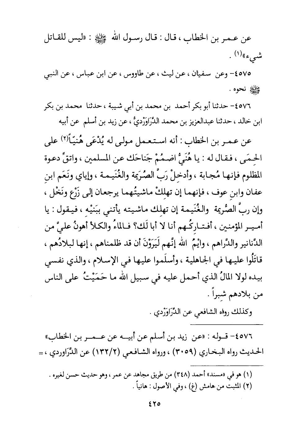 4576 - نا أَبُو بَكْرٍ أَحْمَدُ بْنُ مُحَمَّدِ بْنِ أَبِي شَيْبَةَ , نا مُحَمَّدُ بْنُ بَكْرِ بْنِ خَالِدٍ , نا عَبْدُ الْعَزِيزِ بْنُ مُحَمَّدٍ الدَّرَاوَرْدِيُّ , عَنْ زَيْدِ بْنِ أَسْلَمَ , عَنْ أَبِيهِ , عَنْ عُمَرَ بْنِ الْخَطَّابِ , أَنَّهُ اسْتَعْمَلَ مَوْلًى لَهُ يُدْعَى: هَانِئٌ عَلَى الْحِمَى , فَقَالَ لَهُ: " يَا هَانِئٌ §اضْمُمْ جَنَاحَكَ عَنِ الْمُسْلِمِينَ , وَاتَّقِ دَعْوَةَ الْمَظْلُومِ فَإِنَّهَا مُجَابَةٌ , وَأَدْخِلْ رَبَّ الصُّرَيْمَةِ وَالْغَنِيمَةِ وَإِيَّايَ وَنَعَمَ ابْنِ عَفَّانَ , وَابْنِ عَوْفٍ فَإِنَّهُمَا إِنْ تُهْلِكْ مَاشِيَتُهُمَا يَرْجِعَانِ إِلَى زَرْعٍ وَنَخْلٍ , وَإِنَّ رَبَّ الصُّرَيْمَةِ وَالْغَنِيمَةِ إِنْ تُهْلِكْ مَاشِيَتُهُ يَأْتِينِي بِبَنِيهِ , فَيَقُولُ: يَا أَمِيرَ الْمُؤْمِنِينَ أَفَتَارِكُهُمَا أَنَا لَا أَبَا لَكَ فَالْمَاءُ وَالْكَلَأُ أَهْوَنُ عَلَيَّ مِنَ الدَّنَانِيرِ وَالدَّرَاهِمِ , وَأَيْمُ اللَّهِ إِنَّهُمْ لَيَرَوْنَ أَنْ قَدْ ظَلَمْنَاهُمْ إِنَّهَا لَبِلَادُهُمْ قَاتَلُوا عَلَيْهَا فِي الْجَاهِلِيَّةِ وَأَسْلَمُوا عَلَيْهَا فِي الْإِسْلَامِ وَالَّذِي نَفْسِي بِيَدِهِ لَوْلَا الْمَالُ الَّذِي أَحْمِلُ عَلَيْهِ فِي سَبِيلِ اللَّهِ مَا حَمَيْتُ عَلَى النَّاسِ مِنْ بِلَادِهِمْ شِبْرًا ". وَكَذَلِكَ رَوَاهُ الشَّافِعِيُّ , عَنِ الدَّرَاوَرْدِيِّ