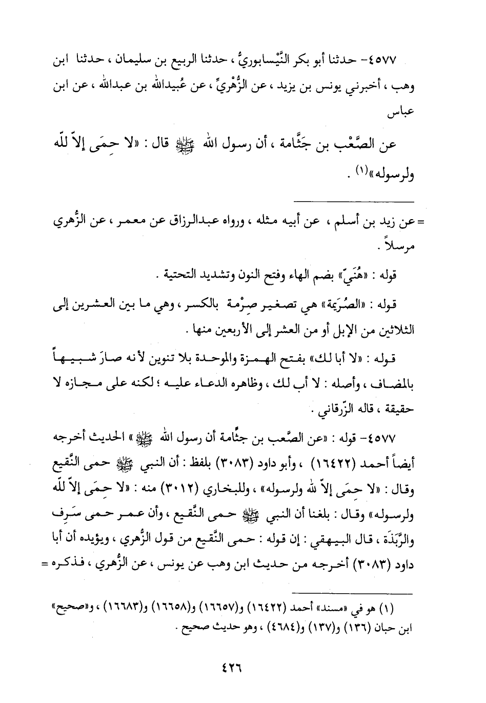 4577 - نا أَبُو بَكْرٍ النَّيْسَابُورِيُّ , نا الرَّبِيعُ بْنُ سُلَيْمَانَ , نا ابْنُ وَهْبٍ , أَخْبَرَنِي يُونُسُ بْنُ يَزِيدَ , عَنِ الزُّهْرِيِّ , عَنْ عُبَيْدِ اللَّهِ بْنِ عَبْدِ اللَّهِ , عَنِ ابْنِ عَبَّاسٍ , عَنِ الصَّعْبِ بْنِ جَثَّامَةَ , أَنَّ رَسُولَ اللَّهِ صَلَّى اللهُ عَلَيْهِ وَسَلَّمَ قَالَ: § «لَا حِمَى إِلَّا لِلَّهِ وَرَسُولِهِ»