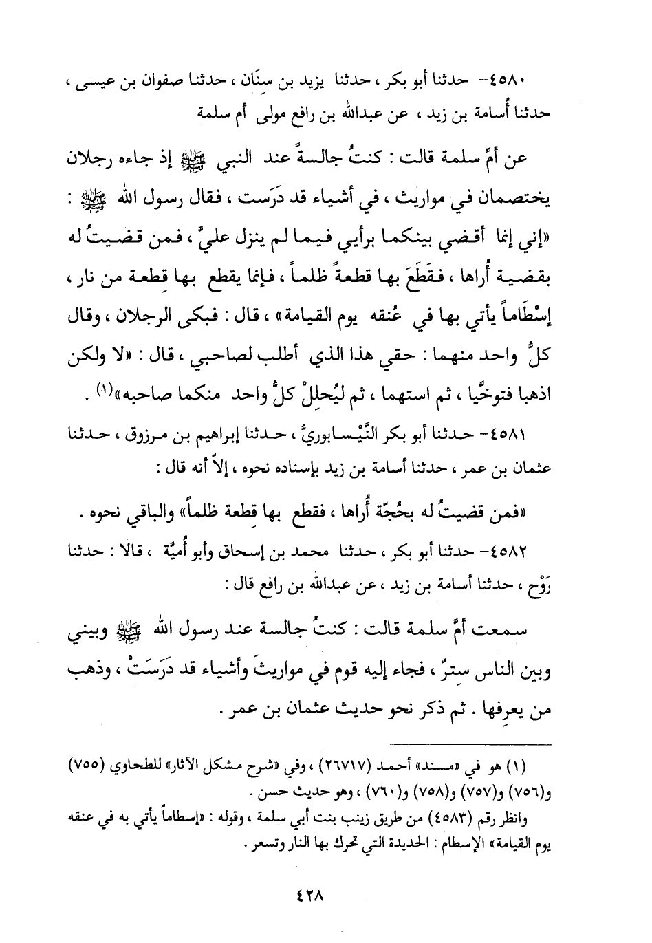 4580 - نا أَبُو بَكْرٍ , نا يَزِيدُ بْنُ سِنَانٍ , نا صَفْوَانُ بْنُ عِيسَى , نا أُسَامَةُ بْنُ زَيْدٍ , عَنْ عَبْدِ اللَّهِ بْنِ رَافِعٍ مَوْلَى أُمِّ سَلَمَةَ , عَنْ أُمِّ سَلَمَةَ , قَالَتْ: كُنْتُ جَالِسَةً عِنْدَ النَّبِيِّ صَلَّى اللهُ عَلَيْهِ وَسَلَّمَ إِذْ جَاءَهُ رَجُلَانِ يَخْتَصِمَانِ فِي مَوَارِيثَ فِي أَشْيَاءَ قَدْ دَرَسَتْ , فَقَالَ رَسُولُ اللَّهِ صَلَّى اللهُ عَلَيْهِ وَسَلَّمَ: «إِنِّي إِنَّمَا §أَقْضِي بَيْنَكُمَا بِرَأْيِي فِيمَا لَمْ يَنْزِلْ عَلَيَّ فَمَنْ قَضَيْتُ لَهُ لِقَضِيَّةٍ أَرَاهَا فَقَطَعَ بِهَا قِطْعَةً ظُلْمًا فَإِنَّمَا يَقْطَعُ بِهَا قِطْعَةً مِنْ نَارٍ , اسْطَامًا يَأْتِي بِهَا فِي عُنُقِهِ يَوْمَ الْقِيَامَةِ» , قَالَ: فَبَكَى الرَّجُلَانِ وَقَالَ كُلُّ وَاحِدٍ مِنْهُمَا: حَقِّي هَذَا الَّذِي أَطْلُبُ لِصَاحِبِي , قَالَ: «لَا وَلَكِنِ اذْهَبَا فَتَوَخَّيَا ثُمَّ اسْتَهِمَا ثُمَّ لِيُحْلِلْ كُلُّ وَاحِدٍ مِنْكُمَا صَاحِبَهُ».