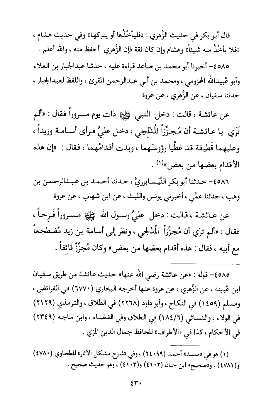 4585 - نا أَبُو مُحَمَّدِ بْنُ صَاعِدٍ , نا عَبْدُ الْجَبَّارِ بْنُ الْعَلَاءِ , وَأَبُو عُبَيْدِ اللَّهِ الْمَخْزُومِيُّ , وَمُحَمَّدُ بْنُ أَبِي عَبْدِ الرَّحْمَنِ الْمُقْرِئُ وَاللَّفْظُ لِعَبْدِ الْجَبَّارِ , قَالُوا: نا سُفْيَانُ عَنِ الزُّهْرِيِّ عَنْ عُرْوَةَ عَنْ عَائِشَةَ رَضِيَ اللَّهُ عَنْهَا , قَالَتْ: دَخَلَ عَلَيَّ النَّبِيُّ صَلَّى اللهُ عَلَيْهِ وَسَلَّمَ ذَاتَ يَوْمٍ مَسْرُورًا , فَقَالَ: " أَلَمْ تَرِي يَا عَائِشَةُ أَنَّ مُجَزِّزًا الْمُدْلِجِيَّ دَخَلَ عَلَيَّ فَرَأَى أُسَامَةَ , وَزَيْدًا §وَعَلَيْهِمَا قَطِيفَةً قَدْ غَطَّيَا رُءُوسَهُمَا وَبَدَتْ أَقْدَامُهُمَا , فَقَالَ: هَذِهِ الْأَقْدَامُ بَعْضُهَا مِنْ بَعْضٍ "