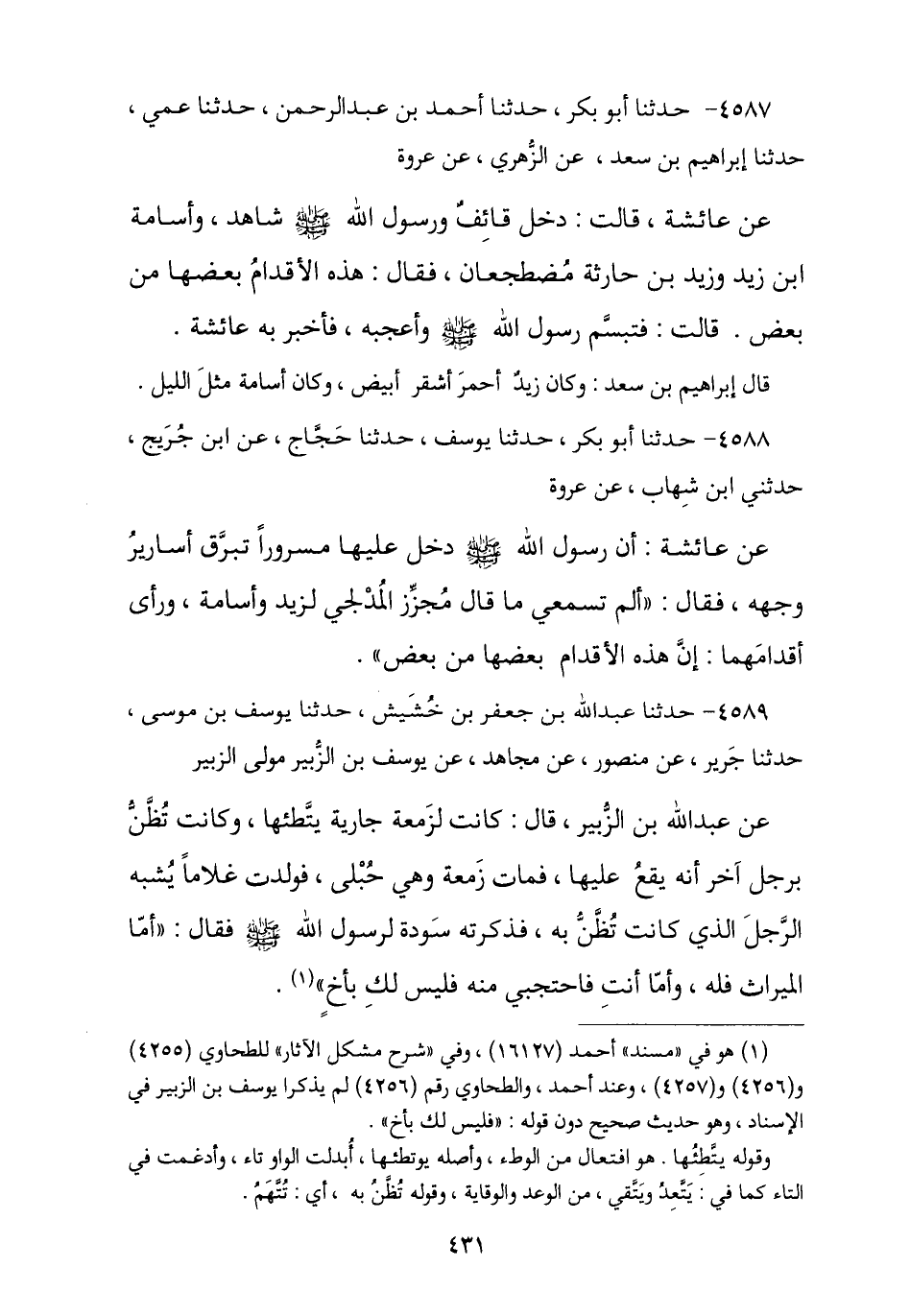 4587 - حَدَّثَنَا أَبُو بَكْرٍ , نا أَحْمَدُ بْنُ عَبْدِ الرَّحْمَنِ , نا ابْنُ وَهْبٍ , نا إِبْرَاهِيمُ بْنُ سَعْدٍ , عَنِ الزُّهْرِيِّ , عَنْ عُرْوَةَ , عَنْ عَائِشَةَ , قَالَتْ: §دَخَلَ قَائِفٌ وَرَسُولُ اللَّهِ صَلَّى اللهُ عَلَيْهِ وَسَلَّمَ شَاهِدٌ وَأُسَامَةُ بْنُ زَيْدٍ , وَزَيْدُ بْنُ حَارِثَةَ مُضْطَجِعَانِ , فَقَالَ: هَذِهِ الْأَقْدَامُ بَعْضُهَا مِنْ بَعْضٍ , قَالَتْ: «فَتَبَسَّمَ رَسُولُ اللَّهِ صَلَّى اللهُ عَلَيْهِ وَسَلَّمَ وَأَعْجَبَهُ فَأَخْبَرَ بِهِ عَائِشَةَ». قَالَ إِبْرَاهِيمُ بْنُ سَعْدٍ: وَكَانَ زَيْدٌ أَحْمَرَ أَشْقَرَ أَبْيَضَ وَكَانَ أُسَامَةُ مِثْلَ اللَّيْلِ