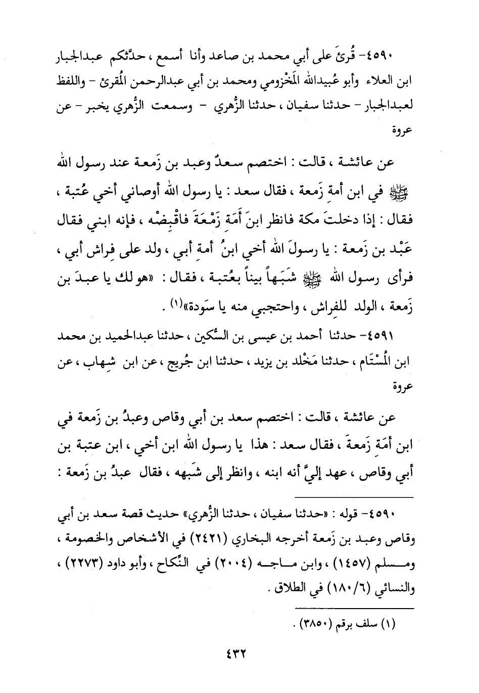 4590 - قُرِئَ عَلَى أَبِي مُحَمَّدِ بْنِ صَاعِدٍ وَأَنَا أَسْمَعُ: حَدَّثَكُمْ عَبْدُ الْجَبَّارِ بْنُ الْعَلَاءِ , وَأَبُو عُبَيْدِ اللَّهِ الْمَخْزُومِيُّ وَمُحَمَّدُ بْنُ أَبِي عَبْدِ الرَّحْمَنِ الْمُقْرِئُ , وَاللَّفْظُ لِعَبْدِ الْجَبَّارِ: نا سُفْيَانُ , نا الزُّهْرِيُّ , وَسَمِعْتُ الزُّهْرِيَّ , يُخْبِرُ عَنْ عُرْوَةَ , عَنْ عَائِشَةَ , قَالَتِ: اخْتَصَمَ سَعْدٌ وَعَبْدُ بْنُ زَمْعَةَ عِنْدَ رَسُولِ اللَّهِ صَلَّى اللهُ عَلَيْهِ وَسَلَّمَ , فَقَالَ سَعْدٌ: يَا رَسُولَ اللَّهِ أَوْصَانِي أَخِي عُتْبَةُ فَقَالَ: إِذَا دَخَلْتَ مَكَّةَ فَانْظُرِ ابْنَ أَمَةِ زَمْعَةَ فَاقْبِضْهُ فَإِنَّهُ ابْنِي , فَقَالَ عَبْدُ بْنُ زَمْعَةَ: يَا رَسُولَ اللَّهِ، أَخِي، ابْنُ أَمَةِ أَبِي، وُلِدَ عَلَى فِرَاشِ أَبِي , فَرَأَى رَسُولُ اللَّهِ صَلَّى اللهُ عَلَيْهِ وَسَلَّمَ شَبَهًا بَيِّنًا بِعُتْبَةَ , فَقَالَ: «هُوَ لَكَ يَا عَبْدُ بْنَ زَمْعَةَ §الْوَلَدُ لِلْفِرَاشِ , وَاحْتَجِبِي مِنْهُ يَا سَوْدَةُ»
