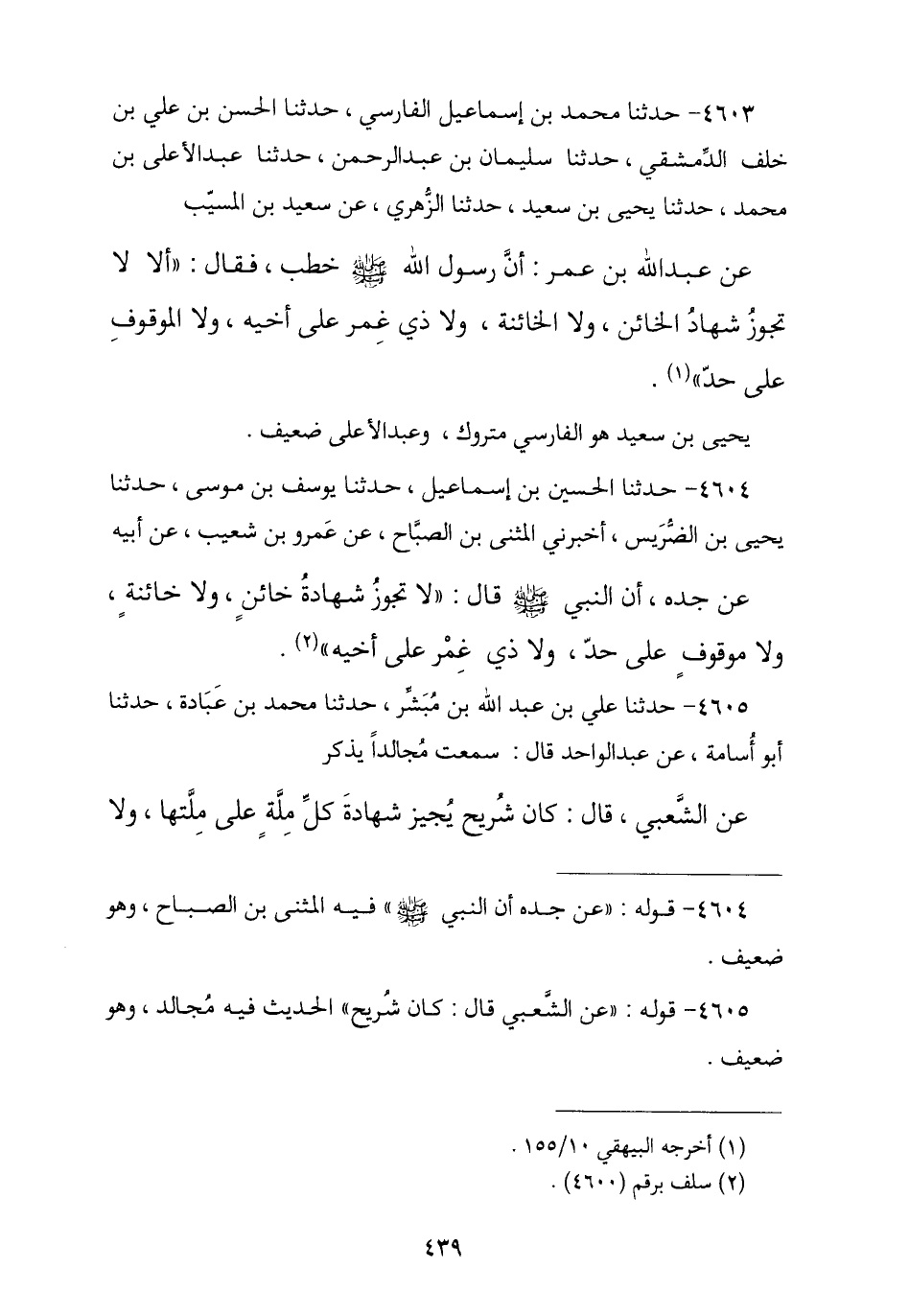 4603 - حَدَّثَنَا مُحَمَّدُ بْنُ إِسْمَاعِيلَ الْفَارِسِيُّ , نا الْحَسَنُ بْنُ عَلِيِّ بْنِ خَلَفٍ الدِّمَشْقِيُّ , نا سُلَيْمَانُ بْنُ عَبْدِ الرَّحْمَنِ , نا عَبْدُ الْأَعْلَى بْنُ مُحَمَّدٍ , نا يَحْيَى بْنُ سَعِيدٍ , نا الزُّهْرِيُّ , عَنْ سَعِيدِ بْنِ الْمُسَيِّبِ , عَنْ عَبْدِ اللَّهِ بْنِ عُمَرَ , أَنَّ رَسُولَ اللَّهِ صَلَّى اللهُ عَلَيْهِ وَسَلَّمَ خَطَبَ , فَقَالَ: «أَلَا §لَا تَجُوزُ شَهَادَةُ الْخَائِنِ وَلَا الْخَائِنَةِ وَلَا ذِي غِمْرٍ عَلَى أَخِيهِ وَلَا الْمَوْقُوفِ عَلَى حَدٍّ». يَحْيَى بْنُ سَعِيدٍ هُوَ الفَارِسِيُّ مَتْرُوكٌ , وَعَبْدُ الْأَعْلَى ضَعِيفٌ