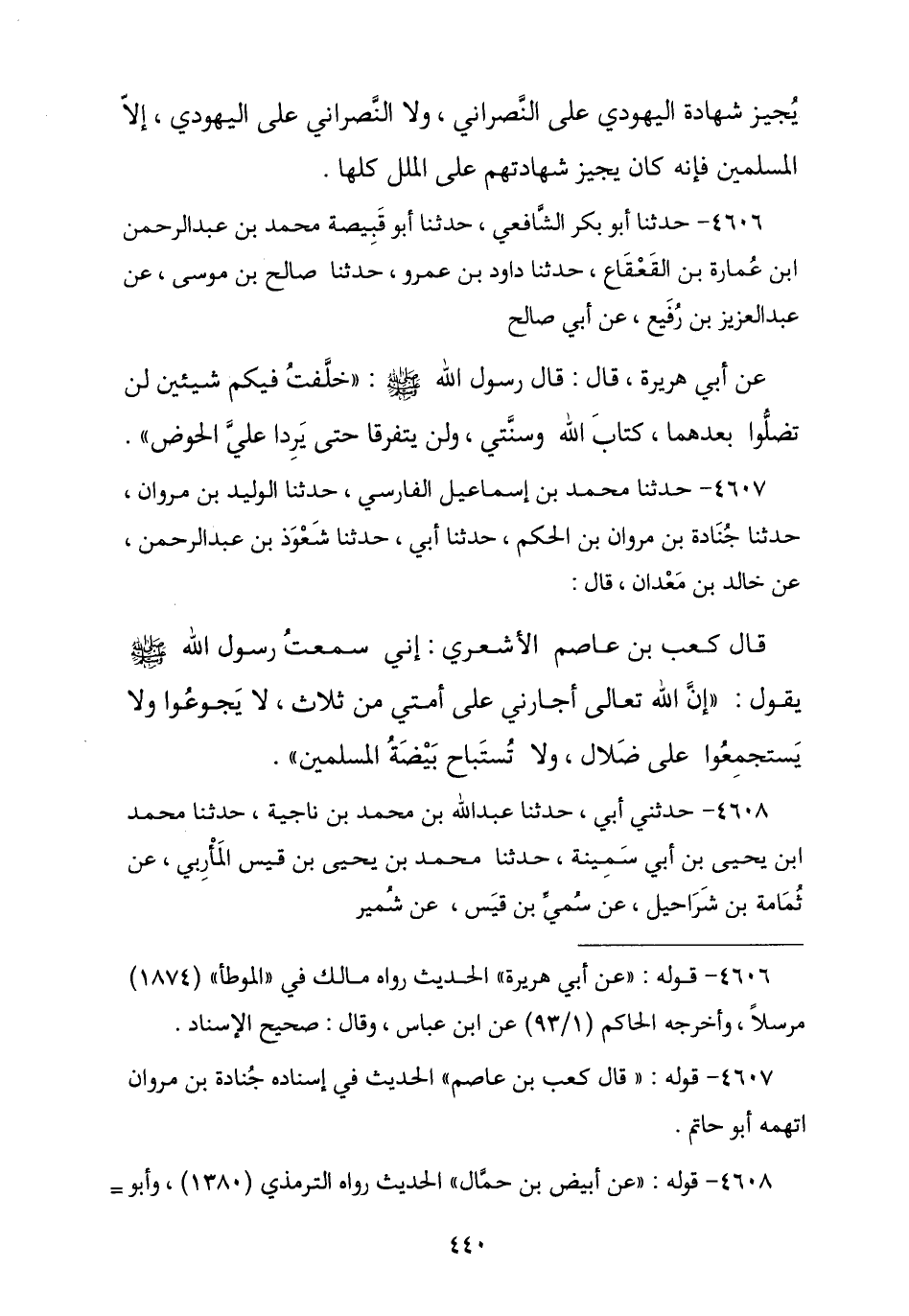 4606 - حَدَّثَنَا أَبُو بَكْرٍ الشَّافِعِيُّ , نا أَبُو قَبِيصَةَ مُحَمَّدُ بْنُ عَبْدِ الرَّحْمَنِ بْنِ عُمَارَةَ بْنِ الْقَعْقَاعِ , نا دَاوُدُ بْنُ عَمْرٍو , نا صَالِحُ بْنُ مُوسَى , عَنْ عَبْدِ الْعَزِيزِ بْنِ رُفَيْعٍ , عَنْ أَبِي صَالِحٍ , عَنْ أَبِي هُرَيْرَةَ , قَالَ: قَالَ رَسُولُ اللَّهِ صَلَّى اللهُ عَلَيْهِ وَسَلَّمَ: " §خَلَّفْتُ فِيكُمْ شَيْئَيْنِ لَنْ تَضِلُّوا بَعْدَهُمَا: كِتَابُ اللَّهِ وَسُنَّتِي , وَلَنْ يَفْتَرِقَا حَتَّى يَرِدَا عَلَيَّ الْحَوْضَ "