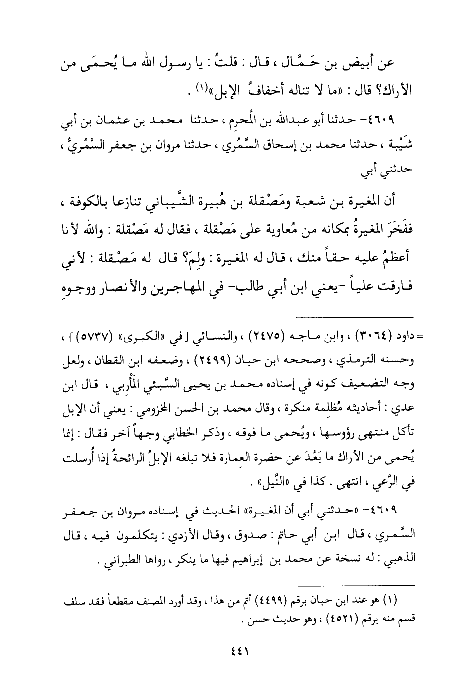 4609 - حَدَّثَنَا أَبُو عَبْدِ اللَّهِ بْنُ الْمُحْرِمِ , نا مُحَمَّدُ بْنُ عُثْمَانَ بْنِ أَبِي شَيْبَةَ , نا مُحَمَّدُ بْنُ إِسْحَاقَ السَّمْرِيُّ , نا مَرْوَانُ بْنُ جَعْفَرٍ السَّمْرِيُّ , حَدَّثَنِي أَبِي , أَنَّ الْمُغِيرَةِ بْنَ شُعْبَةَ , وَمَصْقَلَةَ بْنَ هُبَيْرَةَ