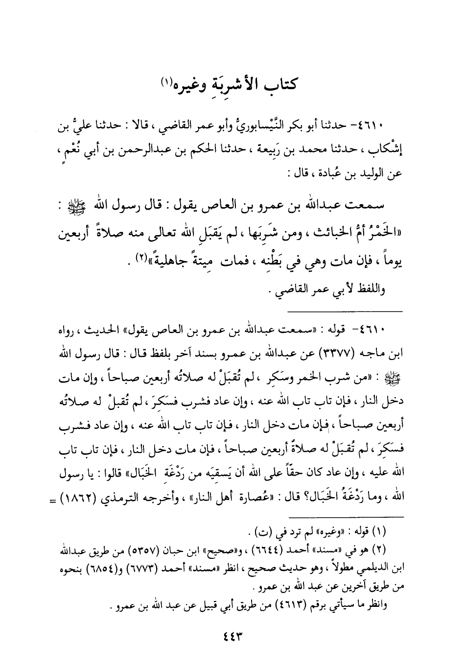 4610 - حَدَّثَنَا أَبُو بَكْرٍ النَّيْسَابُورِيُّ , وَأَبُو عُمَرَ الْقَاضِي , قَالَا: نا عَلِيُّ بْنُ أَشْكَابٍ , نا مُحَمَّدُ بْنُ رَبِيعَةَ , نا الْحَكَمُ بْنُ عَبْدِ الرَّحْمَنِ بْنِ أَبِي نُعْمٍ , عَنِ الْوَلِيدِ بْنِ عُبَادَةَ , قَالَ: سَمِعْتُ عَبْدَ اللَّهِ بْنَ عَمْرِو بْنِ الْعَاصِ , يَقُولُ: قَالَ رَسُولُ اللَّهِ صَلَّى اللهُ عَلَيْهِ وَسَلَّمَ: § «الْخَمْرُ أُمُّ الْخَبَائِثِ وَمَنْ شَرِبَهَا لَمْ يَقْبَلِ اللَّهُ مِنْهُ صَلَاةً أَرْبَعِينَ يَوْمًا , فَإِنْ مَاتَ وَهِيَ فِي بَطْنِهِ مَاتَ مَيْتَةً جَاهِلِيَّةً». وَاللَّفْظُ لِأَبِي عُمَرَ الْقَاضِي