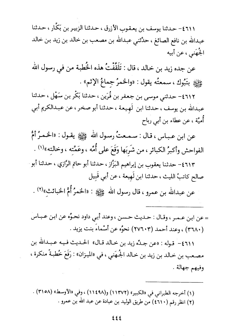 4611 - حَدَّثَنَا يُوسُفُ بْنُ يَعْقُوبَ الْأَزْرَقُ , نا الزُّبَيْرُ بْنُ بَكَّارٍ , نا عَبْدُ اللَّهِ بْنُ نَافِعٍ الصَّائِغُ , حَدَّثَنِي عَبْدُ اللَّهِ بْنُ مُصْعَبِ بْنِ خَالِدِ بْنِ زَيْدِ بْنِ خَالِدٍ الْجُهَنِيُّ , عَنْ أَبِيهِ , عَنْ جَدِّهِ زَيْدِ بْنِ خَالِدٍ قَالَ: تَلَقَّفْتُ هَذِهِ الْخُطْبَةَ مِنْ فِي رَسُولِ اللَّهِ صَلَّى اللهُ عَلَيْهِ وَسَلَّمَ بِتَبُوكَ , سَمِعْتُهُ يَقُولُ: § «وَالْخَمْرُ جِمَاعُ الْإِثْمِ»