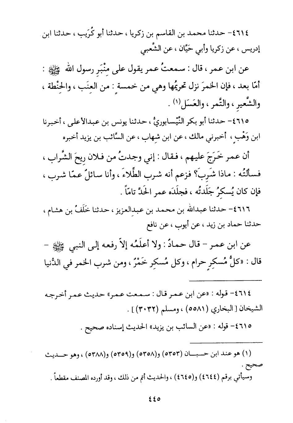 4616 - نا عَبْدُ اللَّهِ بْنُ مُحَمَّدِ بْنِ عَبْدِ الْعَزِيزِ , نا خَلَفُ بْنُ هِشَامٍ , نا حَمَّادُ بْنُ زَيْدٍ , عَنْ أَيُّوبَ , عَنْ نَافِعٍ , عَنِ ابْنِ عُمَرَ , قَالَ حَمَّادٌ: وَلَا أَعْلَمُهُ إِلَّا رَفَعَهُ إِلَى النَّبِيِّ صَلَّى اللهُ عَلَيْهِ وَسَلَّمَ , قَالَ: § «كُلُّ مُسْكِرٍ حَرَامٌ , وَكُلُّ مُسْكِرٍ خَمْرٌ , وَمَنْ شَرِبَ الْخَمْرَ فِي الدُّنْيَا -[446]- فَمَاتَ وَهُوَ يُدْمِنُهَا لَمْ يَشْرَبْهَا فِي الْآخِرَةِ».