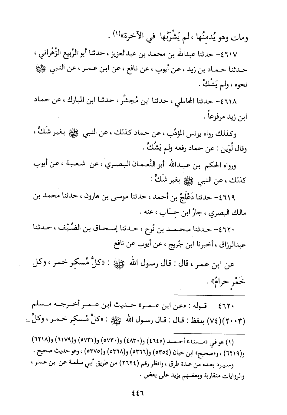 4620 - حَدَّثَنَا مُحَمَّدُ بْنُ نُوحٍ , نا إِسْحَاقُ بْنُ الضَّيْفِ , نا عَبْدُ الرَّزَّاقِ , أنا ابْنُ جُرَيْجٍ , عَنْ أَيُّوبَ , عَنْ نَافِعٍ , عَنِ ابْنِ عُمَرَ , قَالَ: قَالَ رَسُولُ اللَّهِ صَلَّى اللهُ عَلَيْهِ وَسَلَّمَ: § «كُلُّ مُسْكِرٍ خَمْرٌ , وَكُلُّ مُسْكِرٍ حَرَامٌ»