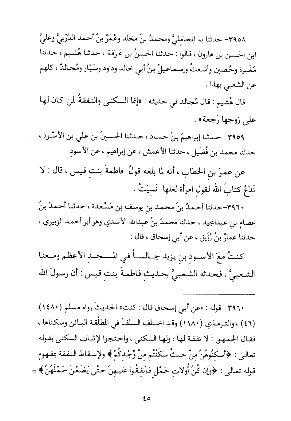 3960 - نا أَحْمَدُ بْنُ مُحَمَّدِ بْنِ يُوسُفَ بْنِ مَسْعَدَةَ , نا أَحْمَدُ بْنُ عِصَامِ بْنِ عَبْدِ الْمَجِيدِ , نا مُحَمَّدُ بْنُ عَبْدِ اللَّهِ الْأَسَدِيُّ وَهُوَ أَبُو أَحْمَدَ الزُّبَيْرِيُّ , نا عَمَّارُ بْنُ رُزَيْقٍ , عَنْ أَبِي إِسْحَاقَ , قَالَ: كُنْتُ مَعَ الْأَسْوَدِ بْنِ يَزِيدَ جَالِسًا فِي الْمَسْجِدِ الْأَعْظَمِ وَمَعَنَا الشَّعْبِيُّ , فَحَدَّثَ الشَّعْبِيُّ بِحَدِيثِ فَاطِمَةَ بِنْتِ قَيْسٍ أَنَّ رَسُولَ اللَّهِ -[46]- صَلَّى اللهُ عَلَيْهِ وَسَلَّمَ «§لَمْ يَجْعَلْ لَهَا سُكْنَى وَلَا نَفَقَةً» فَأَخَذَ الْأَسْوَدُ كَفًّا مِنْ حَصَى فَحَصَبَهُ , ثُمَّ قَالَ: وَيْلَكَ تُحَدِّثُ بِمِثْلِ هَذَا , قَالَ عُمَرُ: لَا نَتْرُكُ كِتَابَ اللَّهِ وَسُنَّةَ نَبِيِّنَا صَلَّى اللهُ عَلَيْهِ وَسَلَّمَ لِقَوْلِ امْرَأَةٍ لَا نَدْرِي حَفِظَتْ أَوْ نَسِيَتْ , لَهَا السُّكْنَى وَالنَّفَقَةُ , قَالَ اللَّهُ تَعَالَى {لَا تُخْرِجُوهُنَّ مِنْ بُيُوتِهِنَّ} [الطلاق: 1] الْآيَةَ