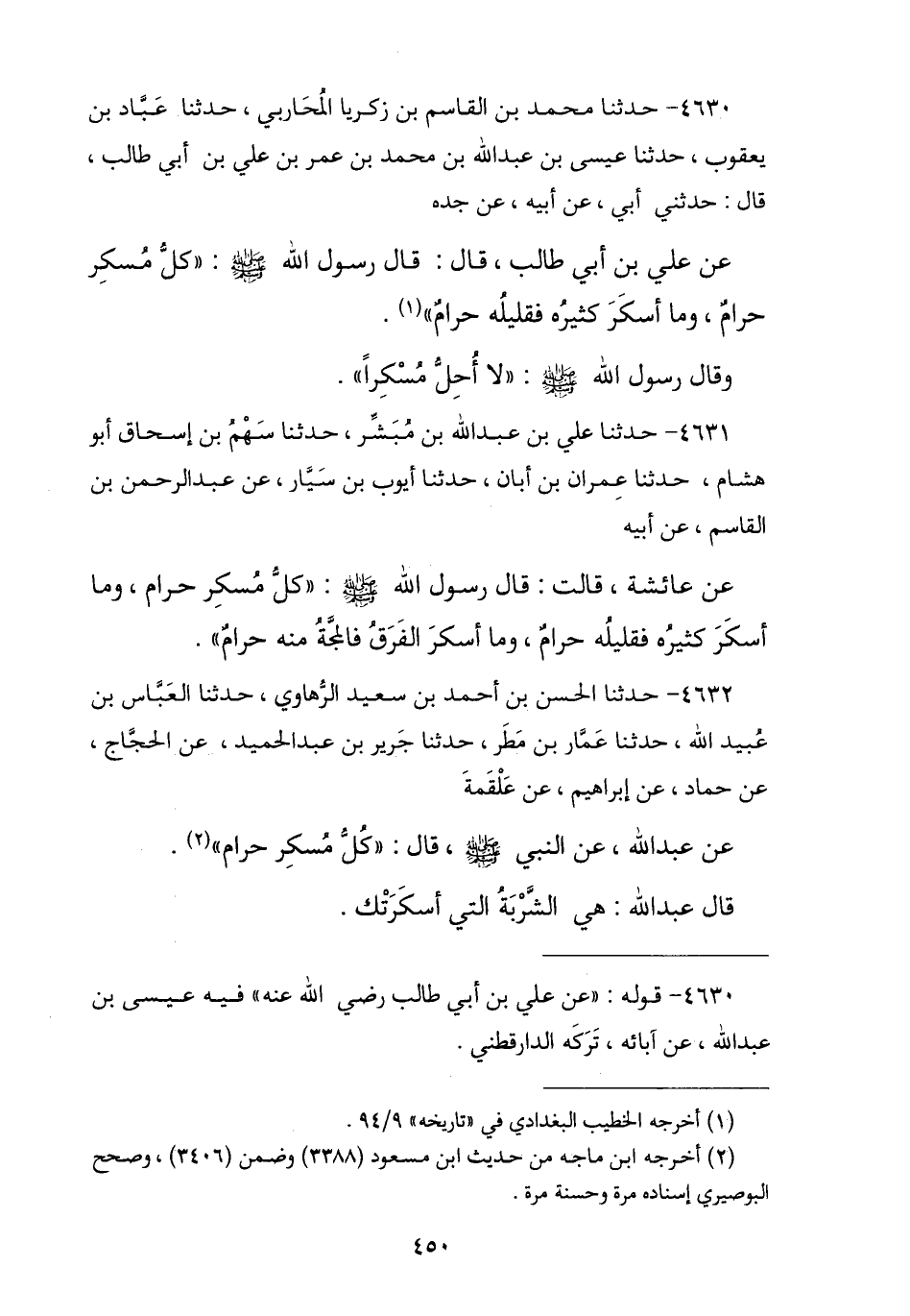 4630 - حَدَّثَنَا مُحَمَّدُ بْنُ الْقَاسِمِ بْنِ زَكَرِيَّا الْمُحَارِبِيُّ , نا عَبَّادُ بْنُ يَعْقُوبَ , نا عِيسَى بْنُ عَبْدِ اللَّهِ بْنِ مُحَمَّدِ بْنِ عُمَرَ بْنِ عَلِيِّ بْنِ أَبِي طَالِبٍ , حَدَّثَنِي أَبِي , عَنْ أَبِيهِ , عَنْ جَدِّهِ , عَنْ عَلِيِّ بْنِ أَبِي طَالِبٍ رَضِيَ اللَّهُ عَنْهُ , قَالَ: قَالَ رَسُولُ اللَّهِ صَلَّى اللهُ عَلَيْهِ وَسَلَّمَ: § «كُلُّ مُسْكِرٍ حَرَامٌ , وَمَا أَسْكَرَ كَثِيرُهُ فَقَلِيلُهُ حَرَامٌ»