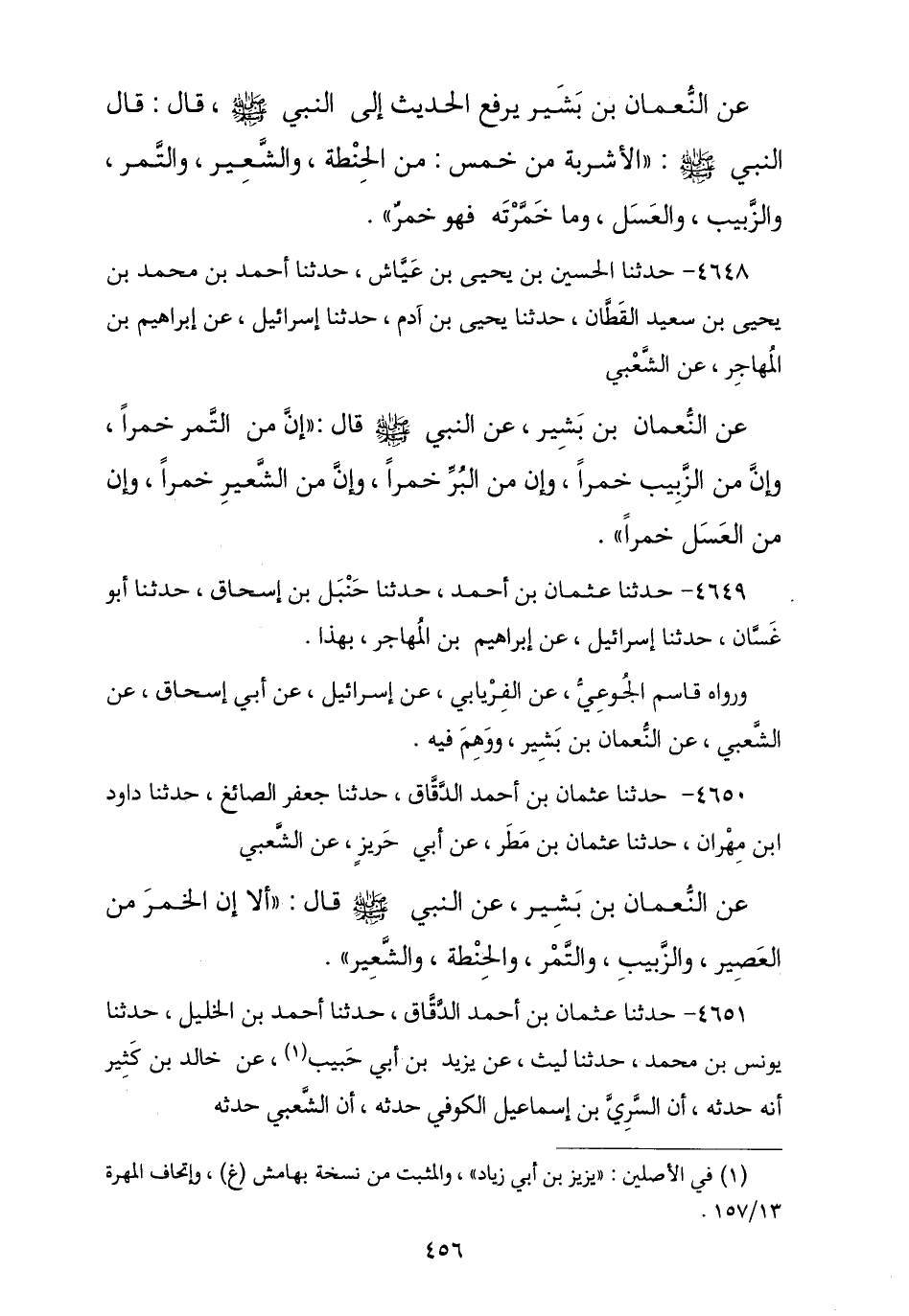 4651 - أَخْبَرَنَا عُثْمَانُ بْنُ أَحْمَدَ الدَّقَّاقُ , نا أَحْمَدُ بْنُ الْخَلِيلِ , نا يُونُسُ بْنُ مُحَمَّدٍ , نا لَيْثٌ , عَنْ يَزِيدَ بْنِ أَبِي حَبِيبٍ , عَنْ خَالِدِ بْنِ كَثِيرٍ أَنَّهُ حَدَّثَهُ , أَنَّ السَّرِيَّ بْنَ إِسْمَاعِيلَ الْكُوفِيَّ حَدَّثَهُ , أَنَّ الشَّعْبِيَّ حَدَّثَهُ , -[457]- أَنَّهُ سَمِعَ النُّعْمَانَ بْنَ بَشِيرٍ , يَقُولُ: قَالَ رَسُولُ اللَّهِ صَلَّى اللهُ عَلَيْهِ وَسَلَّمَ: «إِنَّ مِنَ الْحِنْطَةِ خَمْرًا , وَمِنَ الشَّعِيرِ خَمْرًا , وَمِنَ الزَّبِيبِ خَمْرًا , وَمِنَ التَّمْرِ خَمْرًا , وَمِنَ الْعَسَلِ خَمْرًا , §وَأَنْهَاكُمْ عَنْ كُلِّ مُسْكِرٍ»