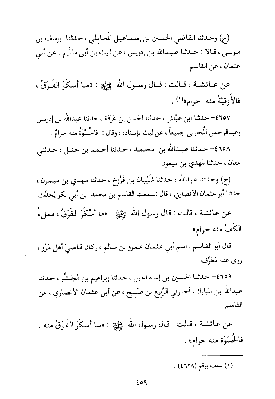 4658 - نا عَبْدُ اللَّهِ بْنُ مُحَمَّدٍ , نا أَحْمَدُ بْنُ حَنْبَلٍ , حَدَّثَنِي عَفَّانُ , حَدَّثَنِي مَهْدِيُّ بْنُ مَيْمُونٍ ح وَنا عَبْدُ اللَّهِ , نا شَيْبَانُ بْنُ فَرُّوخَ , نا مَهْدِيُّ بْنُ مَيْمُونٍ , نا أَبُو عُثْمَانَ الْأَنْصَارِيُّ , قَالَ: سَمِعْتُ الْقَاسِمَ بْنَ مُحَمَّدِ بْنِ أَبِي بَكْرٍ , يُحَدِّثُ عَنْ عَائِشَةَ , قَالَتْ: قَالَ رَسُولُ اللَّهِ صَلَّى اللهُ عَلَيْهِ وَسَلَّمَ: § «مَا أَسْكَرَ الْفَرْقُ فَمِلْءُ الْكَفِّ مِنْهُ حَرَامٌ». قَالَ أَبُو الْقَاسِمِ: اسْمُ أَبِي عُثْمَانَ عَمْرُو بْنُ سَالِمٍ وَكَانَ قَاضِي أَهْلِ مَرْوَ , رَوَى عَنْهُ مُطَرِّفٌ