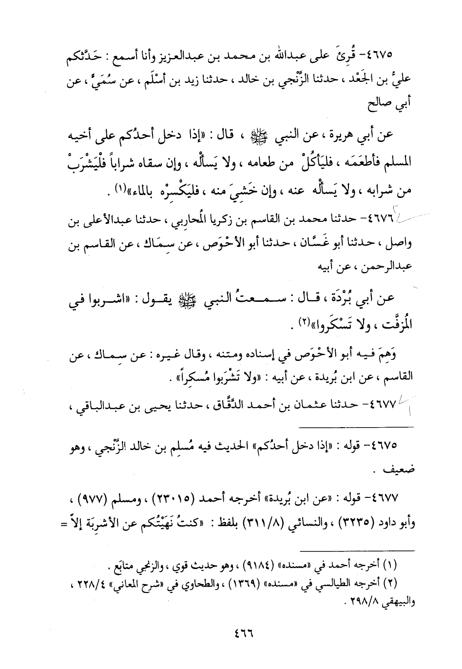 4675 - قُرِئَ عَلَى عَبْدِ اللَّهِ بْنِ مُحَمَّدِ بْنِ عَبْدِ الْعَزِيزِ وَأَنَا أَسْمَعُ: حَدَّثَكُمْ عَلِيُّ بْنُ الْجَعْدِ , حَدَّثَنَا الزَّنْجِيُّ بْنُ خَالِدٍ , نا زَيْدُ بْنُ أَسْلَمَ , عَنْ سُمَيٍّ , عَنْ أَبِي صَالِحٍ , عَنْ أَبِي هُرَيْرَةَ , عَنِ النَّبِيِّ صَلَّى اللهُ عَلَيْهِ وَسَلَّمَ قَالَ: § «إِذَا دَخَلَ أَحَدُكُمْ عَلَى أَخِيهِ الْمُسْلِمِ فَأَطْعَمَهُ فَلْيَأْكُلْ مِنْ طَعَامِهِ وَلَا يَسْأَلْهُ , وَإِنْ سَقَاهُ شَرَابًا فَلْيَشْرَبْ مِنْ شَرَابِهِ وَلَا يَسْأَلْهُ عَنْهُ , وَإِنَّ خَشِيَ مِنْهُ فَلْيُكْسِرْهُ بِالْمَاءِ»