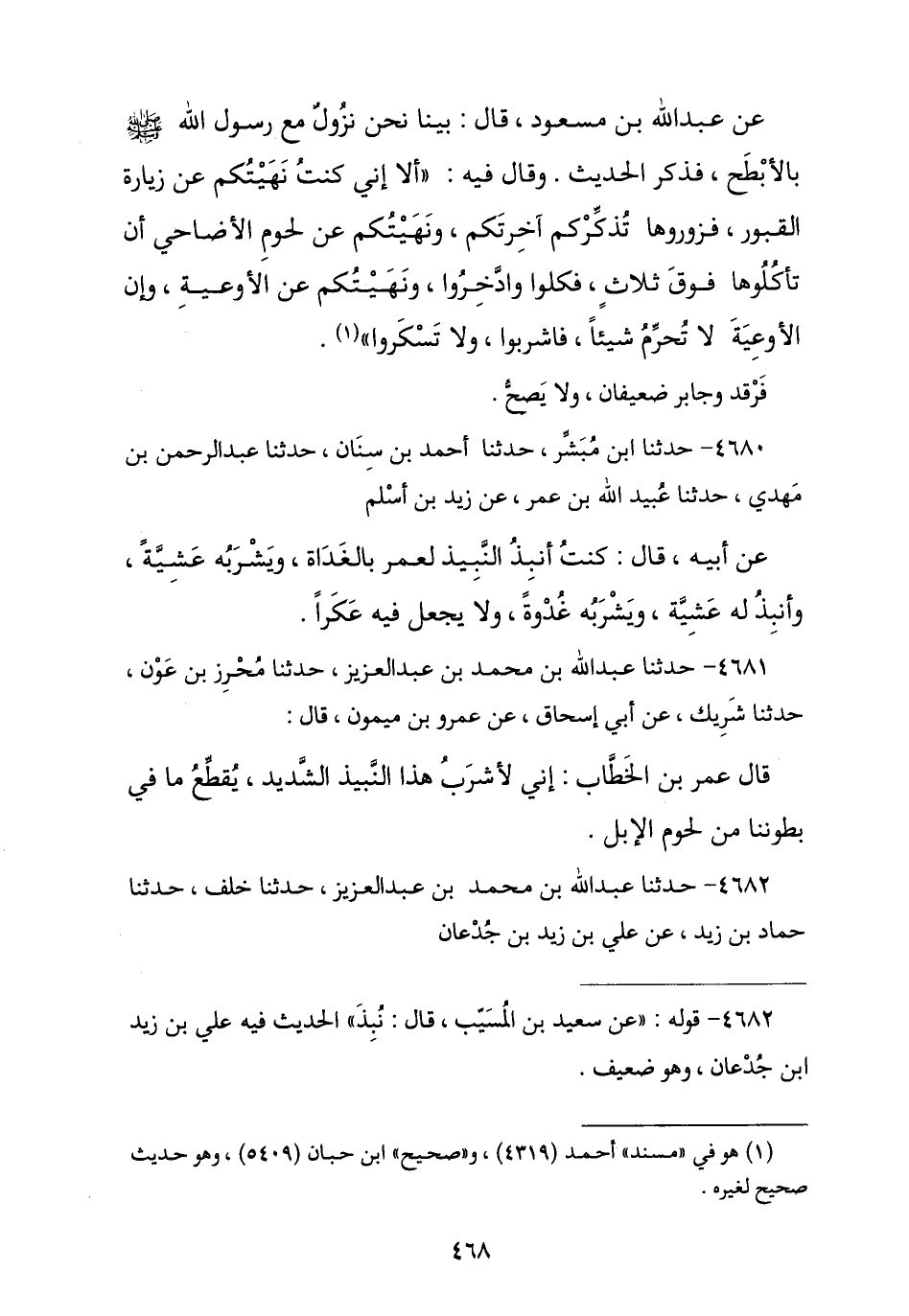 4682 - حَدَّثَنَا عَبْدُ اللَّهِ بْنُ مُحَمَّدٍ , نا خَلَفُ بْنُ هِشَامٍ , نا حَمَّادُ بْنُ زَيْدٍ , عَنْ عَلِيِّ بْنِ زَيْدِ بْنِ جُدْعَانَ , -[469]- عَنْ سَعِيدِ بْنِ الْمُسَيِّبِ , قَالَ: " نُبِذَ لِعُمَرَ لِقُدُومِهِ فَتَأَخَّرَ يَوْمًا فَأَتَى بِنَبِيذٍ قَدِ اشْتَدَّ , قَالَ: §فَدَعَا بِجِفَانٍ فَصَبَّهُ ثُمَّ صَبَّ عَلَيْهِ مِنَ الْمَاءِ "