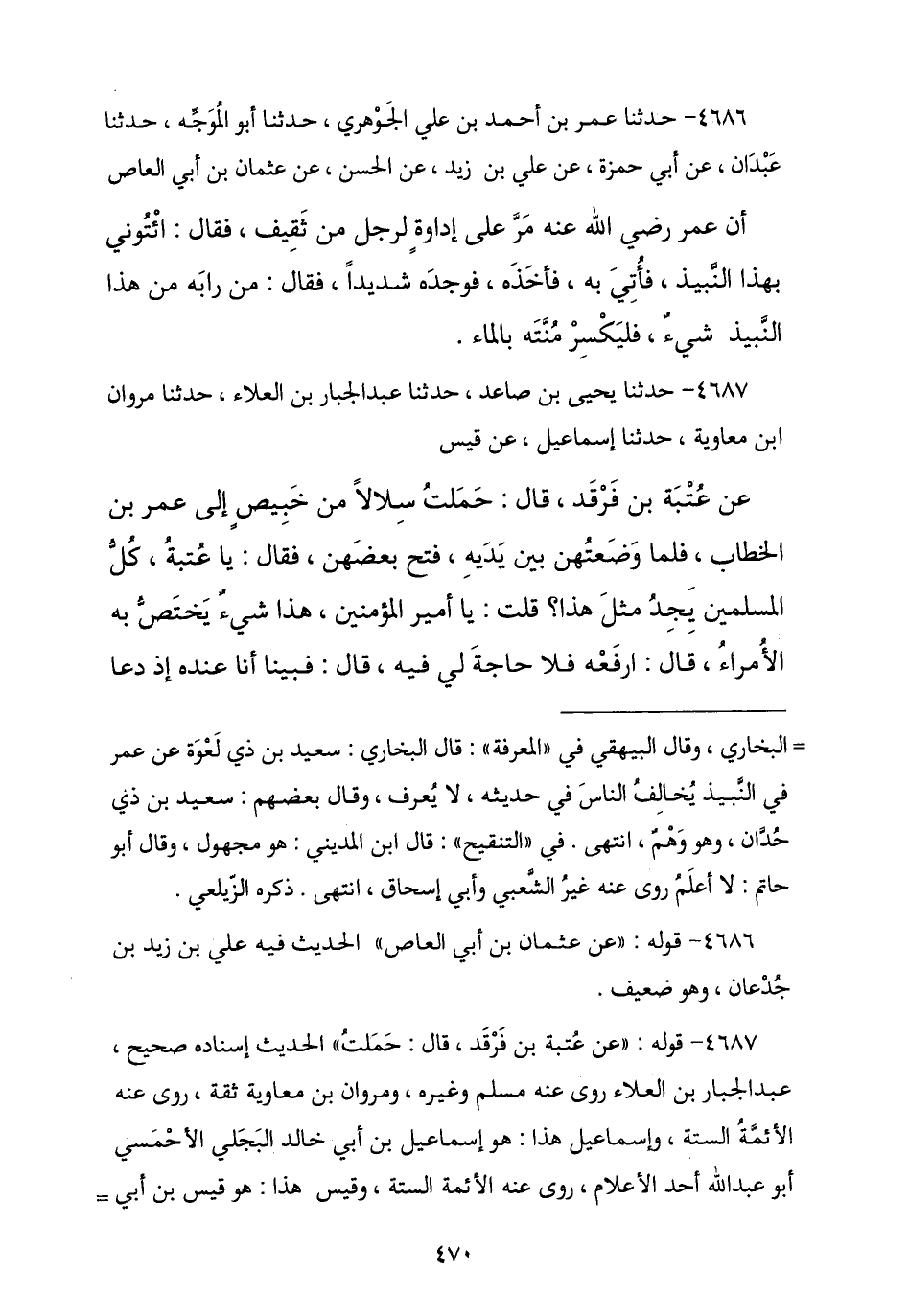 4686 - حَدَّثَنَا عُمَرُ بْنُ أَحْمَدَ بْنِ عَلِيٍّ الْجَوْهَرِيُّ , نا أَبُو الْمُوَجِّهِ , نا عَبْدَانُ , عَنْ أَبِي حَمْزَةَ , عَنْ عَلِيِّ بْنِ زَيْدٍ , عَنِ الْحَسَنِ , عَنْ عُثْمَانَ بْنِ أَبِي الْعَاصِ , أَنَّ عُمَرَ مَرَّ عَلَى إِدَاوَةٍ لِرَجُلٍ مِنْ ثَقِيفٍ , فَقَالَ: § «ائْتُونِي بِهَذَا النَّبِيذِ» , فَأُتِيَ بِهِ فَأَخَذَهُ فَوَجَدَهُ شَدِيدًا , فَقَالَ: «مَنْ رَابَهُ مِنْ هَذَا النَّبِيذِ شَيْءٌ فَلْيَكْسِرْ مُنْتَهُ بِالْمَاءِ»