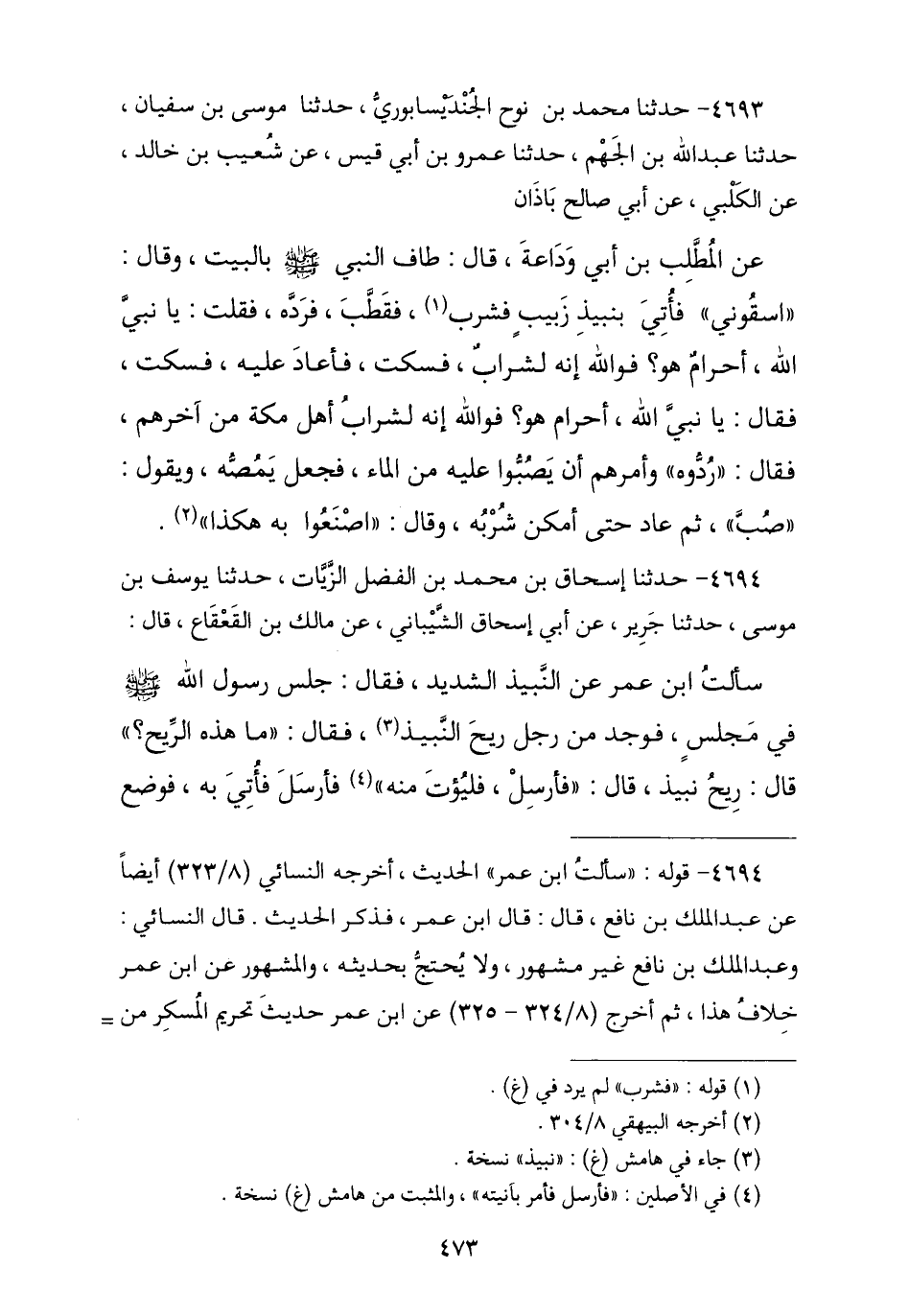 4693 - حَدَّثَنَا مُحَمَّدُ بْنُ نُوحٍ الْجُنْدِيسَابُورِيُّ , نا مُوسَى بْنُ سُفْيَانَ , نا عَبْدُ اللَّهِ بْنُ الْجَهْمِ , نا عَمْرُو بْنُ أَبِي قَيْسٍ , عَنْ شُعَيْبِ بْنِ خَالِدٍ , عَنِ الْكَلْبِيِّ، عَنْ أَبِي صَالِحٍ بَاذَانَ , عَنِ الْمُطَّلِبِ بْنِ أَبِي وَدَاعَةَ , قَالَ: طَافَ النَّبِيُّ صَلَّى اللهُ عَلَيْهِ وَسَلَّمَ بِالْبَيْتِ , وَقَالَ: «اسْقُونِي» , فَأُتِيَ بِنَبِيذِ زَبِيبٍ فَشَرِبَ فَقَطَّبَ فَرَدَّهُ , فَقُلْتُ: يَا نَبِيَّ اللَّهِ أَحَرَامٌ هُوَ؟ فَوَاللَّهِ إِنَّهُ لَشَرَابٌ , فَسَكَتَ فَأَعَادَ عَلَيْهِ فَسَكَتَ , فَقَالَ: يَا نَبِيَّ اللَّهِ أَحَرَامٌ هُوَ؟ فَوَاللَّهِ إِنَّهُ لَشَرَابُ أَهْلِ مَكَّةَ مِنْ آخِرِهِمْ , قَالَ: «رُدُّوهُ» , وَأَمَرَهُمْ أَنْ يَصُبُّوا عَلَيْهِ الْمَاءَ فَجَعَلَ يَمُصُّهُ , وَيَقُولُ: «صَبَّ» , ثُمَّ عَادَ حَتَّى أَمْكَنَ شَرِبَهُ , فَقَالَ: § «اصْنَعُوا بِهِ هَكَذَا»