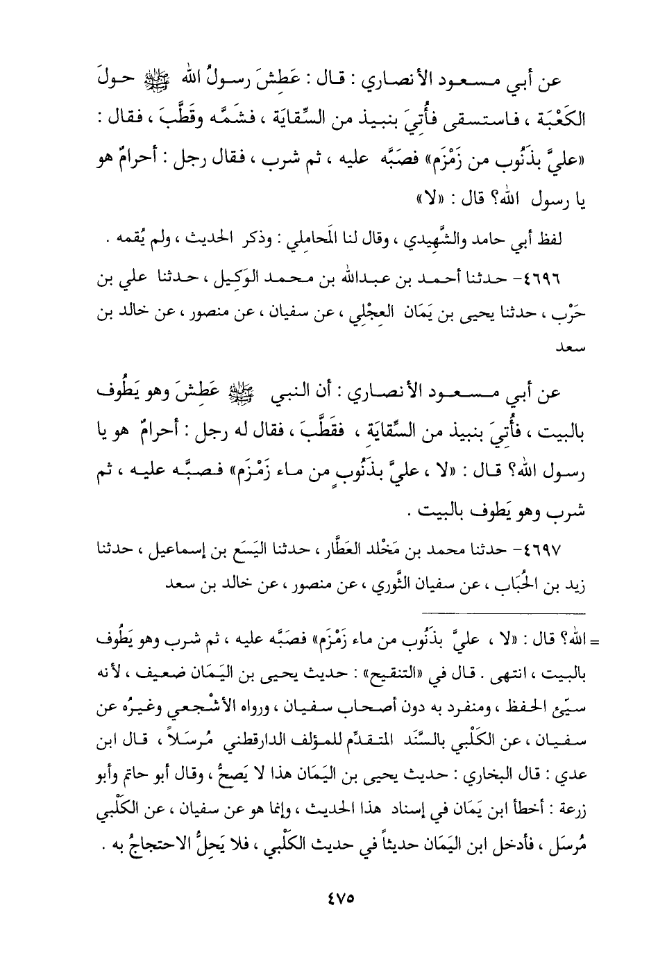 4696 - نا أَحْمَدُ بْنُ عَبْدِ اللَّهِ بْنِ مُحَمَّدٍ الْوَكِيلُ , نا عَلِيُّ بْنُ حَرْبٍ , نا يَحْيَى بْنُ يَمَانٍ الْعِجْلِيُّ , عَنْ سُفْيَانَ , عَنْ مَنْصُورٍ , عَنْ خَالِدِ بْنِ سَعْدٍ , عَنْ أَبِي مَسْعُودٍ الْأَنْصَارِيِّ , أَنَّ النَّبِيَّ صَلَّى اللهُ عَلَيْهِ وَسَلَّمَ عَطِشَ وَهُوَ يَطُوفُ بِالْبَيْتِ فَأُتِيَ بِنَبِيذٍ مِنَ السِّقَايَةِ فَقَطَّبَ , فَقَالَ لَهُ رَجُلٌ: أَحَرَامٌ هُوَ يَا رَسُولَ اللَّهِ؟ , قَالَ: § «لَا عَلَيَّ بِذَنُوبٍ مِنْ مَاءِ زَمْزَمَ» , فَصَبَّهُ عَلَيْهِ ثُمَّ شَرِبَ وَهُوَ يَطُوفُ بِالْبَيْتِ