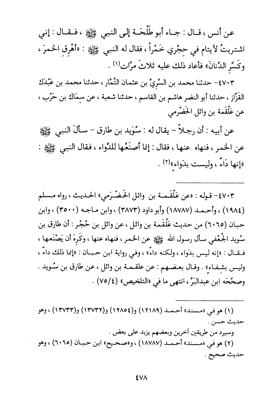 4703 - حَدَّثَنَا مُحَمَّدُ بْنُ السَّرِيِّ بْنِ عُثْمَانَ التَّمَّارُ , نا مُحَمَّدُ بْنُ عَبْدِ الْمَلِكِ الْقَزَّازُ , نا أَبُو النَّضْرِ هَاشِمُ بْنُ الْقَاسِمِ , نا شُعْبَةُ , عَنْ سِمَاكِ بْنِ حَرْبٍ , عَنْ عَلْقَمَةَ بْنِ وَائِلٍ الْحَضْرَمِيِّ , عَنْ أَبِيهِ , أَنَّ رَجُلًا يُقَالُ لَهُ: سُوَيْدُ بْنُ طَارِقٍ سَأَلَ النَّبِيَّ صَلَّى اللهُ عَلَيْهِ وَسَلَّمَ عَنِ الْخَمْرِ فَنَهَاهُ عَنْهَا , فَقَالَ: إِنَّمَا أَصْنَعُهَا لِلدَّوَاءِ , فَقَالَ النَّبِيُّ صَلَّى اللهُ عَلَيْهِ وَسَلَّمَ: «إِنَّهَا §دَاءٌ وَلَيْسَتْ بِدَوَاءٍ»