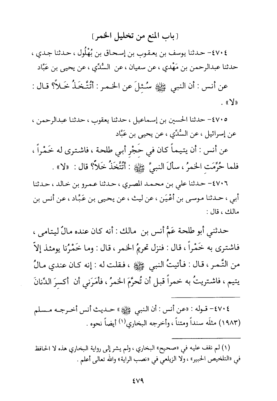 4705 - حَدَّثَنَا الْحُسَيْنُ بْنُ إِسْمَاعِيلَ , نا يَعْقُوبُ , نا عَبْدُ الرَّحْمَنِ , عَنْ إِسْرَائِيلَ , عَنِ السُّدِّيِّ , عَنْ يَحْيَى بْنِ عَبَّادٍ , عَنْ أَنَسٍ , أَنْ يَتِيمًا كَانَ فِي حِجْرِ أَبِي طَلْحَةَ فَاشْتَرَى لَهُ خَمْرًا فَلَمَّا حُرِّمَتْ , سُئِلَ النَّبِيُّ صَلَّى اللهُ عَلَيْهِ وَسَلَّمَ §أَيُتَّخَذُ خَلٍّا؟ , قَالَ: «لَا»