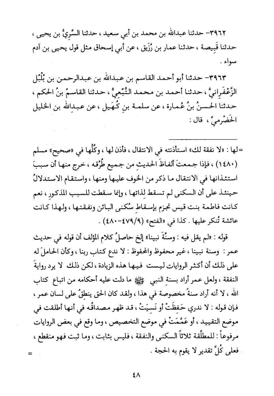 3963 - نا أَبُو أَحْمَدَ الْقَاسِمُ بْنُ عَبْدِ الرَّحْمَنِ بْنِ بِلَيْلٍ الزَّعْفَرَانِيُّ , نا أَحْمَدُ بْنُ مُحَمَّدٍ الشَّعْبِيُّ , نا الْقَاسِمُ بْنُ الْحَكَمِ , نا الْحَسَنُ بْنُ عُمَارَةَ , عَنْ سَلَمَةَ بْنِ كُهَيْلٍ , عَنْ عَبْدِ اللَّهِ بْنِ الْخَلِيلِ الْحَضْرَمِيُّ , قَالَ: -[49]- ذُكِرَ لِعُمَرَ بْنِ الْخَطَّابِ قَوْلُ فَاطِمَةَ بِنْتِ قَيْسٍ , أَنَّ رَسُولَ اللَّهِ صَلَّى اللهُ عَلَيْهِ وَسَلَّمَ § «لَمْ يَجْعَلْ لَهَا السُّكْنَى وَلَا النَّفَقَةَ» , فَقَالَ عُمَرُ: لَا نَدَعُ كِتَابَ اللَّهِ وَسُنَّةَ نَبِيِّهِ لِقَوْلِ امْرَأَةٍ. الْحَسَنُ بْنُ عُمَارَةَ مَتْرُوكٌ