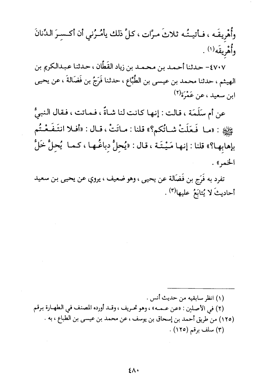 4707 - حَدَّثَنَا أَحْمَدُ بْنُ مُحَمَّدِ بْنِ زِيَادٍ الْقَطَّانُ , نا عَبْدُ الْكَرِيمِ بْنُ الْهَيْثَمِ , نا مُحَمَّدُ بْنُ عِيسَى بْنِ الطَّبَّاعِ , نا فَرَجُ بْنُ فَضَالَةَ , عَنْ يَحْيَى بْنِ سَعِيدٍ , عَنْ عَمْرَةَ , عَنْ أُمِّ سَلَمَةَ , رَضِيَ اللَّهُ عَنْهَا قَالَتْ: كَانَتْ لَنَا شَاةٌ فَمَاتَتْ فَقَالَ النَّبِيُّ صَلَّى اللهُ عَلَيْهِ وَسَلَّمَ: «§مَا فَعَلَتْ شَاتُكُمْ؟» , قُلْنَا: مَاتَتْ , قَالَ: «أَفَلَا انْتَفَعْتُمْ بِإِهَابِهَا؟» , قُلْنَا: إِنَّهَا مَيْتَةٌ قَالَ: «يَحِلُّ دِبَاغُهَا كَمَا يَحِلُّ خَلُّ الْتَمْرِ». تَفَرَّدَ بِهِ فَرَجُ بْنُ فَضَالَةَ عَنْ يَحْيَى وَهُوَ ضَعِيفٌ , يَرْوِي عَنْ يَحْيَى بْنِ سَعْدٍ أَحَادِيثَ عِدَّةً لَا يُتَابَعُ عَلَيْهَا