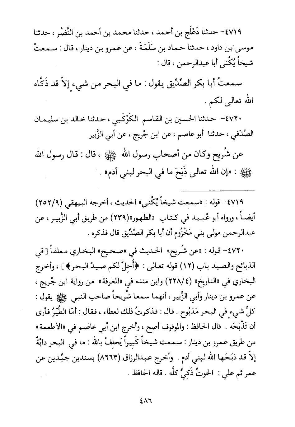 4720 - حَدَّثَنَا الْحُسَيْنُ بْنُ الْقَاسِمِ الْكَوْكَبِيُّ , نا خَالِدُ بْنُ سُلَيْمَانَ الصَّدَفِيُّ , نا أَبُو عَاصِمٍ , عَنِ ابْنِ جُرَيْجٍ , عَنْ أَبِي الزُّبَيْرِ , عَنْ شُرَيْحٍ وَكَانَ مِنْ أَصْحَابِ رَسُولِ اللَّهِ صَلَّى اللهُ عَلَيْهِ وَسَلَّمَ , قَالَ: قَالَ رَسُولُ اللَّهِ صَلَّى اللهُ عَلَيْهِ وَسَلَّمَ: «إِنَّ اللَّهَ تَعَالَى §ذَبَحَ مَا فِي الْبَحْرِ لِبَنِي آدَمَ»