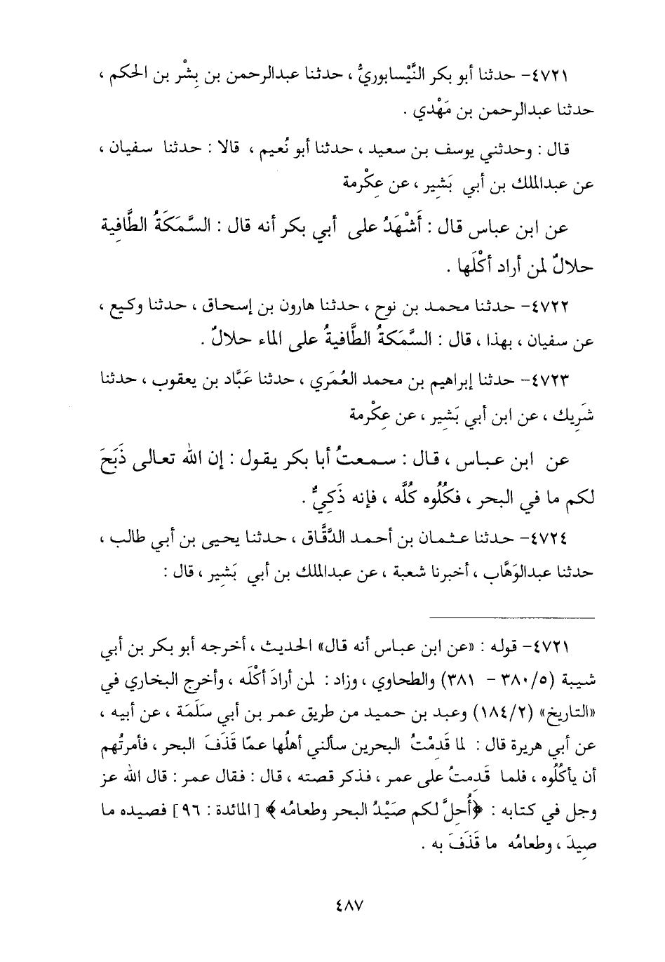 4721 - حَدَّثَنَا أَبُو بَكْرٍ النَّيْسَابُورِيُّ , نا عَبْدُ الرَّحْمَنِ بْنُ بِشْرِ بْنِ الْحَكَمِ , نا عَبْدُ الرَّحْمَنِ بْنُ مَهْدِيٍّ , قَالَ: وَنا يُوسُفُ بْنُ سَعِيدٍ , نا أَبُو نُعَيْمٍ , قَالَا: نا سُفْيَانُ , عَنْ عَبْدِ الْمَلِكِ بْنِ أَبِي بَشِيرٍ , عَنْ عِكْرِمَةَ , عَنِ ابْنِ عَبَّاسٍ , أَنَّهُ قَالَ: أَشْهَدُ عَلَى أَبِي بَكْرٍ أَنَّهُ قَالَ: § «السَّمَكَةُ الطَّافِيَةُ حَلَالٌ لِمَنْ أَرَادَ أَكْلَهَا»