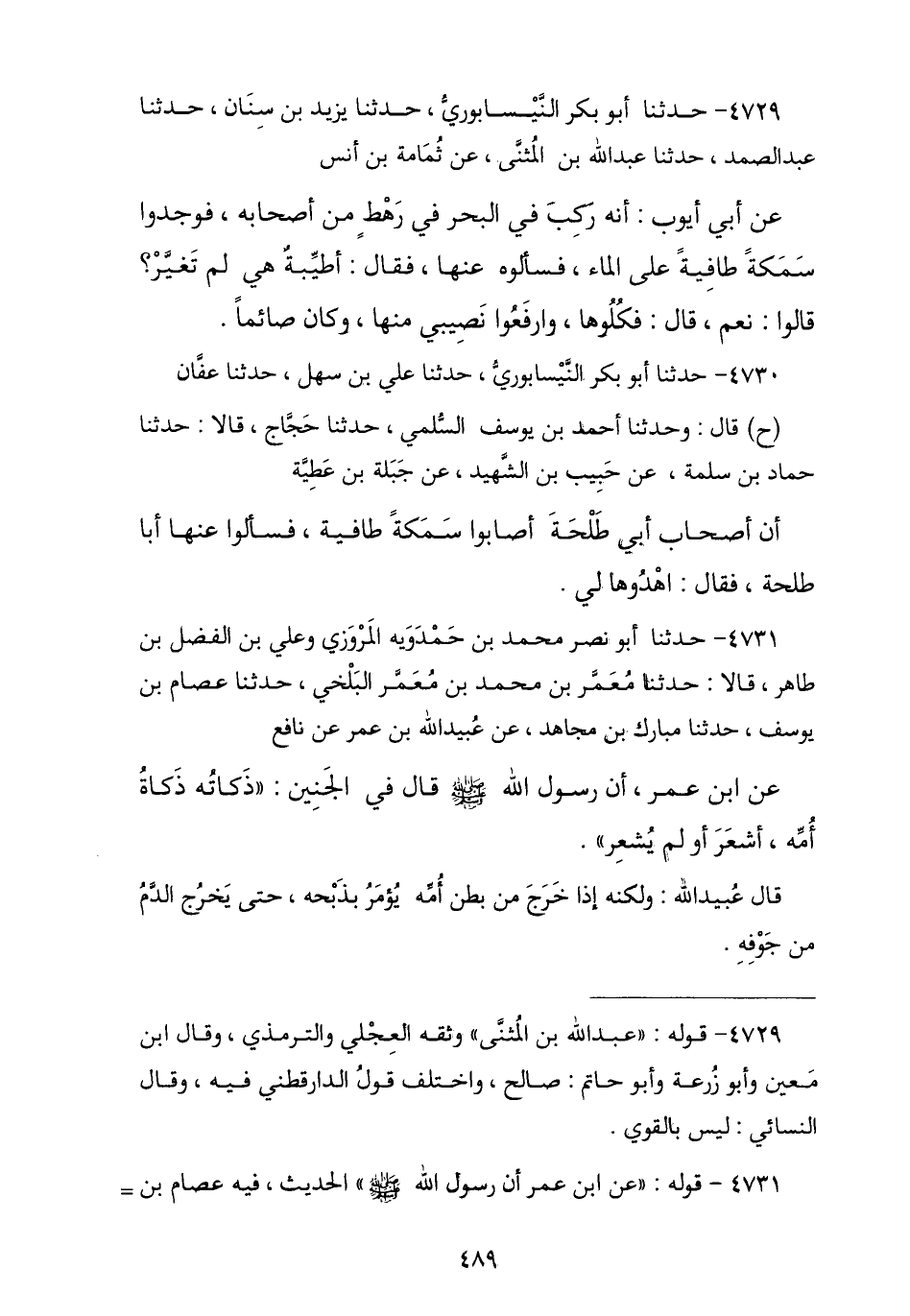 4731 - حَدَّثَنَا أَبُو نَصْرٍ مُحَمَّدُ بْنُ حَمْدَوَيْهِ الْمَرْوَزِيُّ , وَعَلِيُّ بْنُ الْفَضْلِ بْنِ طَاهِرٍ , قَالَا: نا مَعْمَرُ بْنُ مُحَمَّدِ بْنِ مَعْمَرٍ الْبَلْخِيُّ , نا عِصَامُ بْنُ يُوسُفَ , نا مُبَارَكُ بْنُ مُجَاهِدٍ , عَنْ عُبَيْدِ اللَّهِ بْنِ عُمَرَ , عَنْ نَافِعٍ , عَنِ ابْنِ عُمَرَ , أَنَّ رَسُولَ اللَّهِ صَلَّى اللهُ عَلَيْهِ وَسَلَّمَ قَالَ فِي الْجَنِينِ: § «ذَكَاتُهُ ذَكَاةُ أُمِّهِ أَشْعَرَ أَوْ لَمْ يُشْعِرْ». قَالَ عُبَيْدُ اللَّهِ: وَلَكِنَّهُ إِذَا خَرَجَ مِنْ بَطْنِ أُمِّهِ يُؤْمَرُ بِذَبْحِهِ حَتَّى يَخْرُجَ الدَّمُ مِنْ جَوْفِهِ