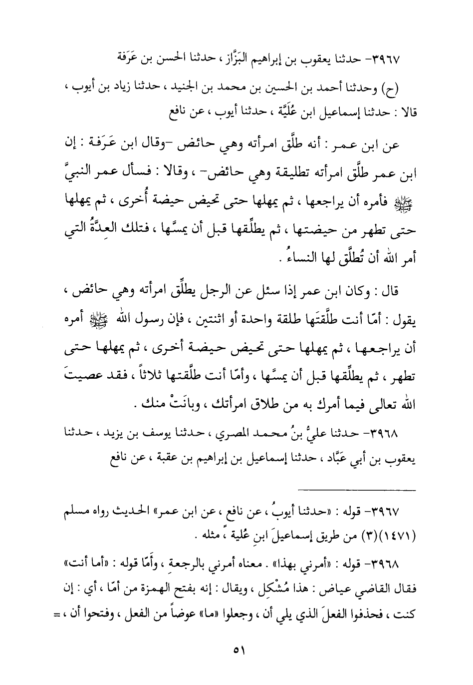 3967 - نا يَعْقُوبُ بْنُ إِبْرَاهِيمَ الْبَزَّازُ , نا الْحَسَنُ بْنُ عَرَفَةَ ح وَنا أَحْمَدُ بْنُ الْحُسَيْنِ بْنِ مُحَمَّدِ بْنِ أَحْمَدَ بْنِ الْجُنَيْدِ , نا زِيَادُ بْنُ أَيُّوبَ , قَالَا: نا إِسْمَاعِيلُ ابْنُ عُلَيَّةَ , نا أَيُّوبُ , عَنْ نَافِعٍ , عَنِ ابْنِ عُمَرَ , أَنَّهُ طَلَّقَ امْرَأَتَهُ وَهِيَ حَائِضٌ , وَقَالَ ابْنُ عَرَفَةَ: إِنَّ ابْنَ عُمَرَ طَلَّقَ امْرَأَتَهُ تَطْلِيقَةً وَهِيَ حَائِضٌ، وَقَالَا: فَسَأَلَ عُمَرُ النَّبِيَّ صَلَّى اللهُ عَلَيْهِ وَسَلَّمَ , فَأَمَرَهُ §أَنْ يُرَاجِعَهَا ثُمَّ يُمْهِلَهَا حَتَّى تَحِيضَ حَيْضَةً أُخْرَى , ثُمَّ يُمْهِلَهَا حَتَّى تَطْهُرَ ثُمَّ يُطَلِّقَهَا قَبْلَ أَنْ يَمَسَّهَا , فَتِلْكَ الْعِدَّةُ الَّتِي أَمَرَ اللَّهُ أَنْ تُطَلَّقَ لَهَا النِّسَاءُ. قَالَ: وَكَانَ ابْنُ عُمَرَ إِذَا سُئِلَ عَنِ الرَّجُلِ يُطَلِّقُ امْرَأَتَهُ وَهِيَ حَائِضٌ يَقُولُ: أَمَّا أَنْتَ طَلَّقْتَهَا طَلْقَةً وَاحِدَةً أَوِ اثْنَتَيْنِ , فَإِنَّ رَسُولَ اللَّهِ صَلَّى اللهُ عَلَيْهِ وَسَلَّمَ أَمَرَهُ أَنْ يُرَاجِعَهَا ثُمَّ يُمْهِلَهَا حَتَّى تَحِيضَ حَيْضَةً أُخْرَى , ثُمَّ يُمْهِلَهَا حَتَّى تَطْهُرَ ثُمَّ يُطَلِّقَهَا قَبْلَ أَنْ يَمَسَّهَا , وَأَمَّا أَنْتَ طَلَّقْتَهَا ثَلَاثًا فَقَدْ عَصَيْتَ اللَّهَ تَعَالَى فِيمَا أَمَرَكَ بِهِ مِنْ طَلَاقِ امْرَأَتِكَ وَبَانَتْ مِنْكَ