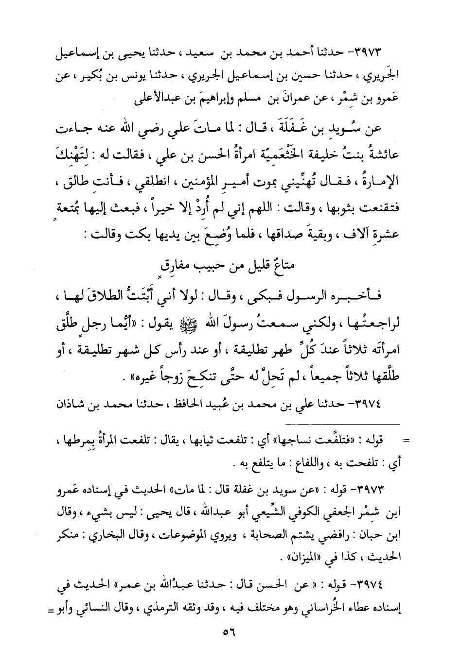 3973 - نا أَحْمَدُ بْنُ مُحَمَّدِ بْنِ سَعِيدٍ , نا يَحْيَى بْنُ إِسْمَاعِيلَ الْجُرَيْرِيُّ , نا حُسَيْنُ بْنُ إِسْمَاعِيلَ الْجُرَيْرِيُّ , نا يُونُسُ بْنُ بُكَيْرٍ , نا عَمْرُو بْنُ شِمْرٍ , عَنْ عِمْرَانَ بْنِ مُسْلِمٍ , وَإِبْرَاهِيمَ بْنِ عَبْدِ الْأَعْلَى , عَنْ سُوَيْدِ بْنِ غَفَلَةَ , قَالَ: لَمَّا مَاتَ عَلِيٌّ رَضِيَ اللَّهُ عَنْهُ جَاءَتْ عَائِشَةُ بِنْتُ خَلِيفَةَ الْخَثْعَمِيَّةُ امْرَأَةُ الْحَسَنِ بْنِ عَلِيٍّ , فَقَالَتْ لَهُ: لِتَهْنِكَ الْإِمَارَةَ , فَقَالَ لَهَا: تُهَنِّينِي بِمَوْتِ أَمِيرِ الْمُؤْمِنِينَ انْطَلِقِي فَأَنْتِ طَالِقٌ فَتَقَنَّعْتُ بِثَوْبِهَا , وَقَالَتِ: اللَّهُمَّ إِنِّي لَمْ أُرِدْ إِلَّا خَيْرًا فَبَعَثَ إِلَيْهَا بِمُتْعَةٍ عَشَرَةِ آلَافٍ وَبَقِيَّةَ صَدَاقِهَا فَلَمَّا وُضِعَ بَيْنَ يَدَيْهَا بَكَتْ , وَقَالَتْ: مَتَاعٌ قَلِيلٌ مِنْ حَبِيبٍ مَفَارِقٍ فَأَخْبَرَهُ الرَّسُولُ , فَبَكَى وَقَالَ: لَوْلَا أَنِّي أَبَنْتُ الطَّلَاقَ لَهَا لَرَاجَعْتُهَا , وَلَكِنِّي سَمِعْتُ رَسُولَ اللَّهِ صَلَّى اللهُ عَلَيْهِ وَسَلَّمَ يَقُولُ: «أَيُّمَا §رَجُلٍ طَلَّقَ امْرَأَتَهُ ثَلَاثًا عِنْدَ كُلِّ طُهْرٍ تَطْلِيقَةً أَوْ عِنْدَ رَأْسِ كُلِّ شَهْرٍ تَطْلِيقَةً أَوْ طَلَّقَهَا ثَلَاثًا جَمِيعًا لَمْ تَحِلَّ حَتَّى تَنْكِحَ زَوْجًا غَيْرَهُ»