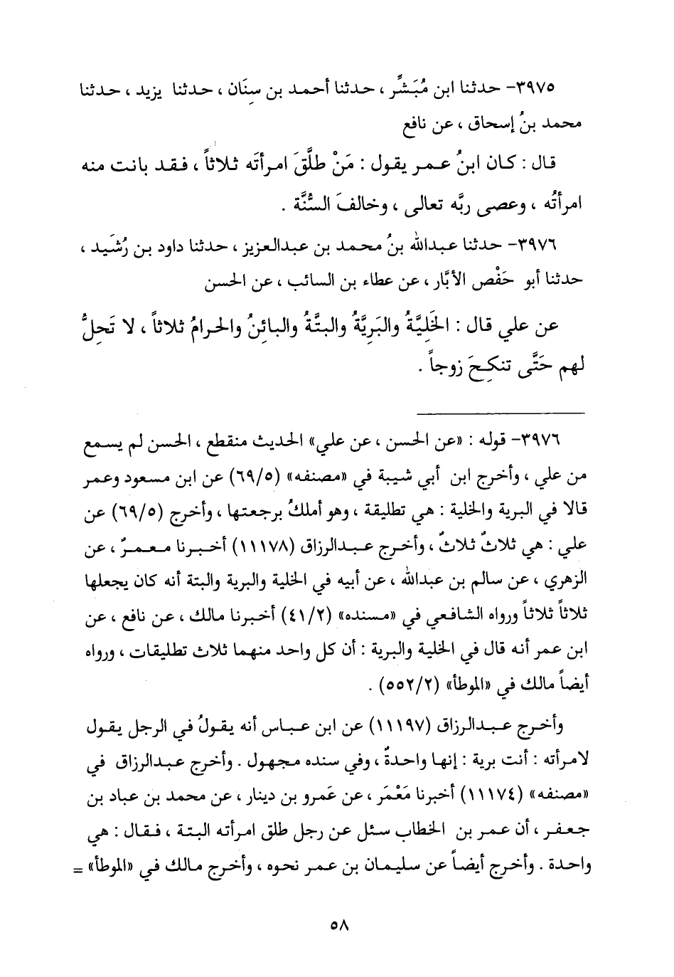 3975 - نا ابْنُ مُبَشِّرٍ , نا أَحْمَدُ بْنُ سِنَانٍ , نا يَزِيدُ , أنا مُحَمَّدُ بْنُ إِسْحَاقَ , عَنْ نَافِعٍ , قَالَ: كَانَ ابْنُ عُمَرَ يَقُولُ: § «مَنْ طَلَّقَ امْرَأَتَهُ ثَلَاثًا فَقَدْ بَانَتْ مِنْهُ امْرَأَتُهُ وَعَصَى رَبَّهُ تَعَالَى وَخَالَفَ السُّنَّةَ»