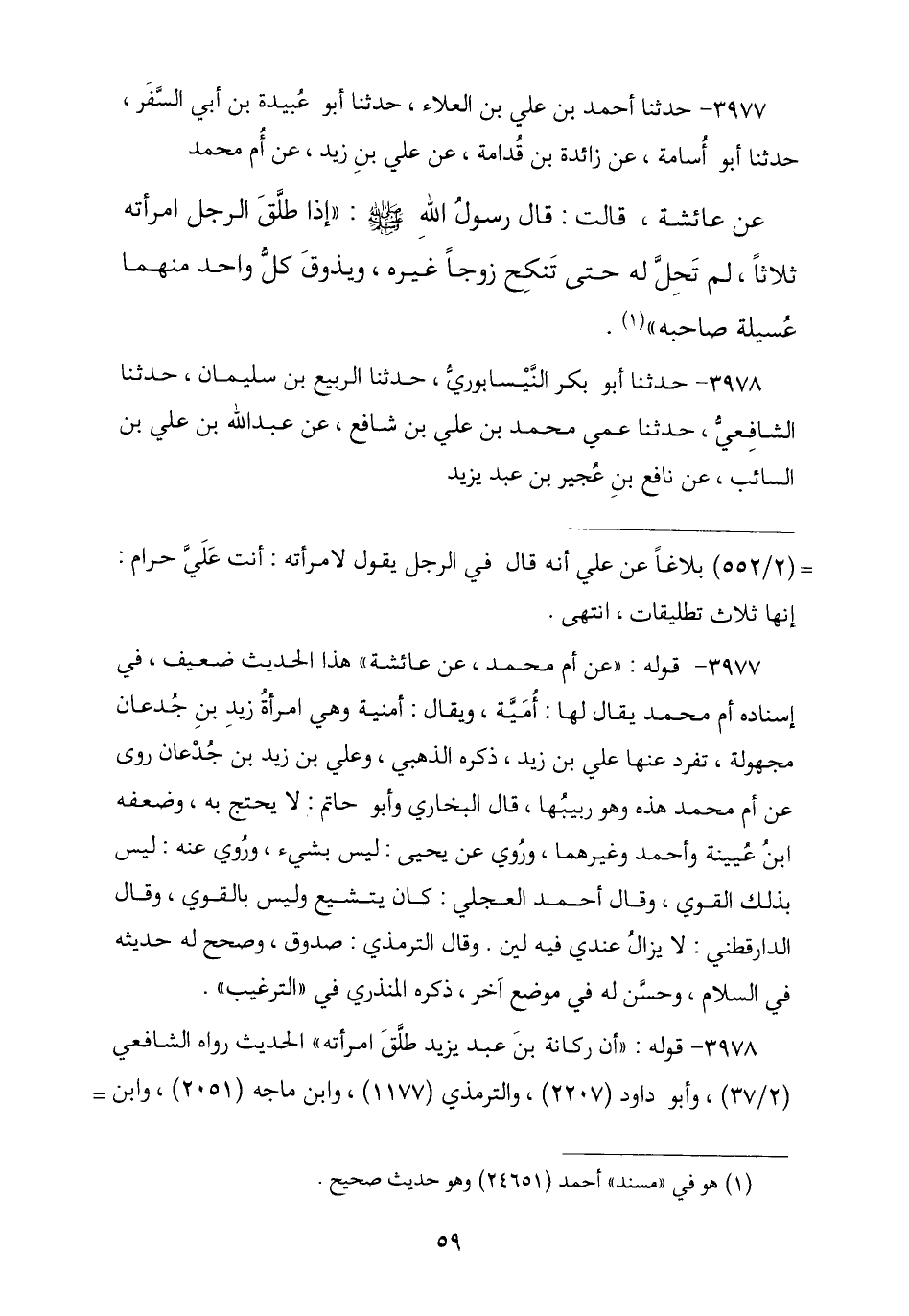 3977 - نا أَحْمَدُ بْنُ عَلِيِّ بْنِ الْعَلَاءِ , نا أَبُو عُبَيْدَةَ بْنُ أَبِي السَّفَرِ , نا أَبُو أُسَامَةَ , عَنْ زَائِدَةَ بْنِ قُدَامَةَ , عَنْ عَلِيِّ بْنِ زَيْدٍ , عَنْ أُمِّ مُحَمَّدٍ , عَنْ عَائِشَةَ , قَالَتْ: قَالَ رَسُولُ اللَّهِ صَلَّى اللهُ عَلَيْهِ وَسَلَّمَ: § «إِذَا طَلَّقَ الرَّجُلُ امْرَأَتَهُ ثَلَاثًا لَمْ تَحِلَّ لَهُ حَتَّى تَنْكِحَ زَوْجًا غَيْرَهُ، وَيَذُوقَ كُلُّ وَاحِدٍ مِنْهُمَا عُسَيْلَةَ صَاحِبِهِ»