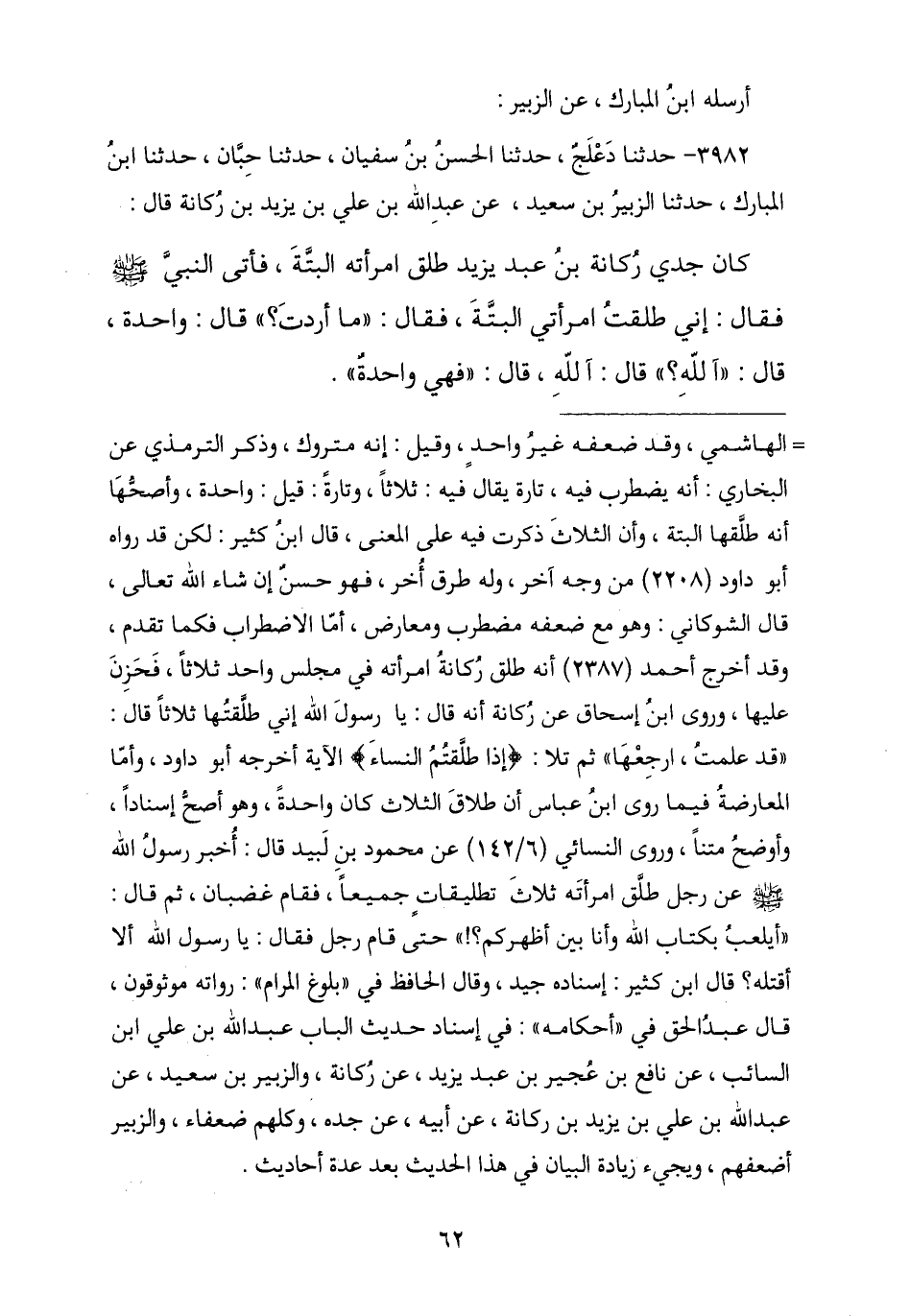3982 - نا دَعْلَجُ بْنُ أَحْمَدَ , نا الْحَسَنُ بْنُ سُفْيَانَ , نا حَبَّانُ , أنا ابْنُ الْمُبَارَكِ , أنا الزُّبَيْرُ بْنُ سَعِيدٍ , أَخْبَرَنِي عَبْدُ اللَّهِ بْنُ عَلِيِّ بْنِ يَزِيدَ بْنِ رُكَانَةَ , قَالَ: كَانَ جَدِّي رُكَانَةُ بْنُ عَبْدِ يَزِيدَ طَلَّقَ امْرَأَتَهُ الْبَتَّةَ , فَأَتَى رَسُولَ اللَّهِ صَلَّى اللهُ عَلَيْهِ وَسَلَّمَ فَقَالَ: إِنِّي طَلَّقْتُ امْرَأَتِي الْبَتَّةَ , فَقَالَ: «§مَا أَرَدْتَ؟» , فَقَالَ: أَرَدْتُ وَاحِدَةً , قَالَ: «آللَّهِ؟» قَالَ: اللَّهِ , قَالَ: «فَهِيَ وَاحِدَةٌ». -[63]- خَالَفَهُ إِسْحَاقُ بْنُ أَبِي إِسْرَائِيلَ