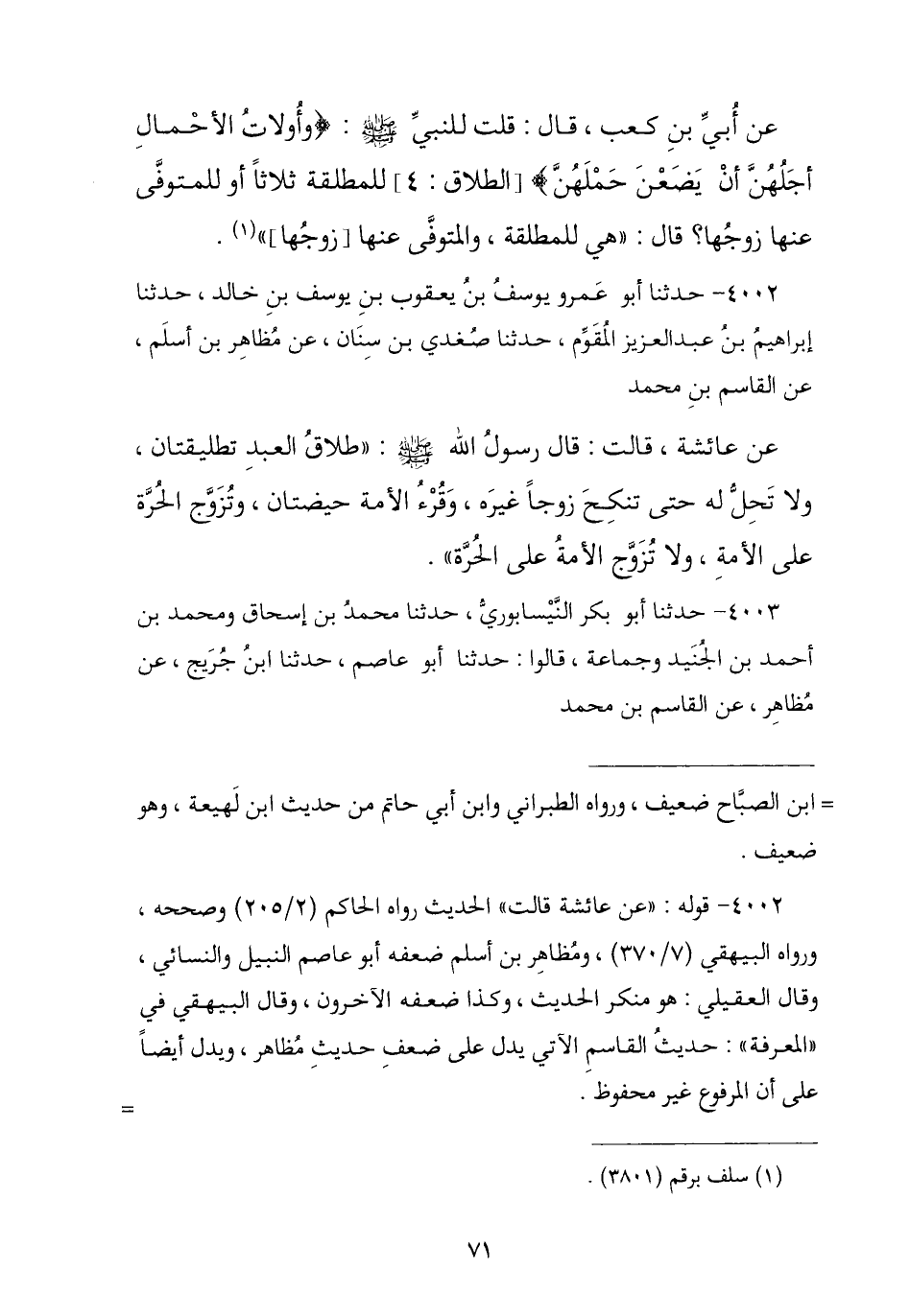 4003 - نا أَبُو بَكْرٍ النَّيْسَابُورِيُّ , نا مُحَمَّدُ بْنُ إِسْحَاقَ , وَمُحَمَّدُ بْنُ أَحْمَدَ بْنِ الْجُنَيْدِ , وَجَمَاعَةٌ قَالُوا: نا أَبُو عَاصِمٍ , نا ابْنُ جُرَيْجٍ , عَنْ مُظَاهِرٍ , عَنِ الْقَاسِمِ بْنِ مُحَمَّدٍ , -[72]- عَنْ عَائِشَةَ , قَالَتْ: قَالَ رَسُولُ اللَّهِ صَلَّى اللهُ عَلَيْهِ وَسَلَّمَ: § «طَلَاقُ الْأَمَةِ تَطْلِيقَتَانِ وَقُرْؤُهَا حَيْضَتَانِ»