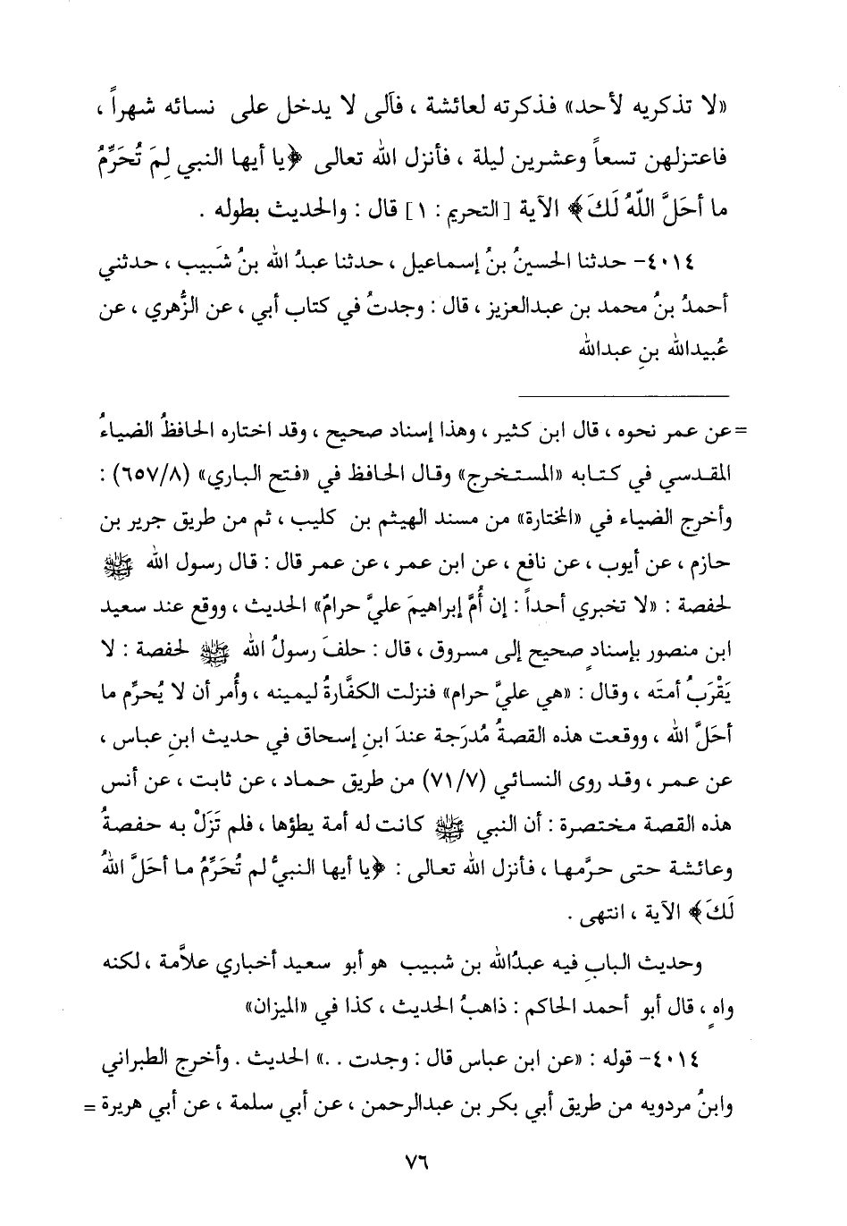 4014 - نا الْحُسَيْنُ بْنُ إِسْمَاعِيلَ , نا عَبْدُ اللَّهِ بْنُ شَبِيبٍ , حَدَّثَنِي أَحْمَدُ بْنُ مُحَمَّدِ بْنِ عَبْدِ الْعَزِيزِ , قَالَ: وَجَدْتُ فِي كِتَابِ أَبِي , عَنِ الزُّهْرِيِّ , عَنْ عُبَيْدِ اللَّهِ بْنِ عَبْدِ اللَّهِ , -[77]- عَنِ ابْنِ عَبَّاسٍ , قَالَ: وَجَدَتْ حَفْصَةُ رَسُولَ اللَّهِ صَلَّى اللهُ عَلَيْهِ وَسَلَّمَ مَعَ أُمِّ إِبْرَاهِيمَ فِي يَوْمِ عَائِشَةَ , فَقَالَتْ: لَأُخْبِرَنَّهَا , فَقَالَ رَسُولُ اللَّهِ صَلَّى اللهُ عَلَيْهِ وَسَلَّمَ: § «هِيَ عَلَيَّ حَرَامٌ إِنْ قَرَبْتُهَا» , فَأَخْبَرَتْ عَائِشَةَ بِذَلِكَ فَأَعْلَمَ اللَّهُ عَزَّ وَجَلَّ رَسُولَهُ بِذَلِكَ فَعَرَّفَ حَفْصَةَ بَعْضَ مَا قَالَتْ قَالَتْ لَهُ: مَنْ أَخْبَرَكَ؟ , قَالَ: " {نَبَّأَنِيَ الْعَلِيمُ الْخَبِيرُ} [التحريم: 3] " فَآلَى رَسُولُ اللَّهِ صَلَّى اللهُ عَلَيْهِ وَسَلَّمَ مِنْ نِسَائِهِ شَهْرًا , فَأَنْزَلَ اللَّهُ {إِنْ تَتُوبَا إِلَى اللَّهِ فَقَدْ صَغَتْ قُلُوبُكُمَا} [التحريم: 4] الْآيَةَ. قَالَ ابْنُ عَبَّاسٍ: فَسَأَلْتُ عُمَرَ: مَنِ اللَّتَانِ تَظَاهَرَتَا عَلَى رَسُولِ اللَّهِ صَلَّى اللهُ عَلَيْهِ وَسَلَّمَ؟ , فَقَالَ: حَفْصَةُ وَعَائِشَةُ