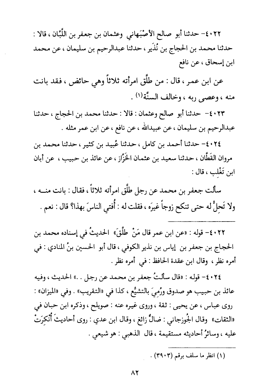 4022 - حَدَّثَنَا أَبُو صَالِحٍ الْأَصْبَهَانِيُّ عَبْدُ الرَّحْمَنِ بْنُ سَعِيدٍ , وَعُثْمَانُ بْنُ جَعْفَرٍ اللَّبَّانُ , قَالَا: نا مُحَمَّدُ بْنُ الْحَجَّاجِ بْنِ نَذِيرٍ , نا عَبْدُ الرَّحِيمِ بْنُ سُلَيْمَانَ , عَنْ مُحَمَّدِ بْنِ إِسْحَاقَ , عَنْ نَافِعٍ , عَنِ ابْنِ عُمَرَ , قَالَ: § «مَنْ طَلَّقَ امْرَأَتَهُ وَهِيَ حَائِضٌ ثَلَاثًا فَقَدْ بَانَتْ مِنْهُ وَعَصَى رَبَّهُ وَخَالَفَ السُّنَّةَ».