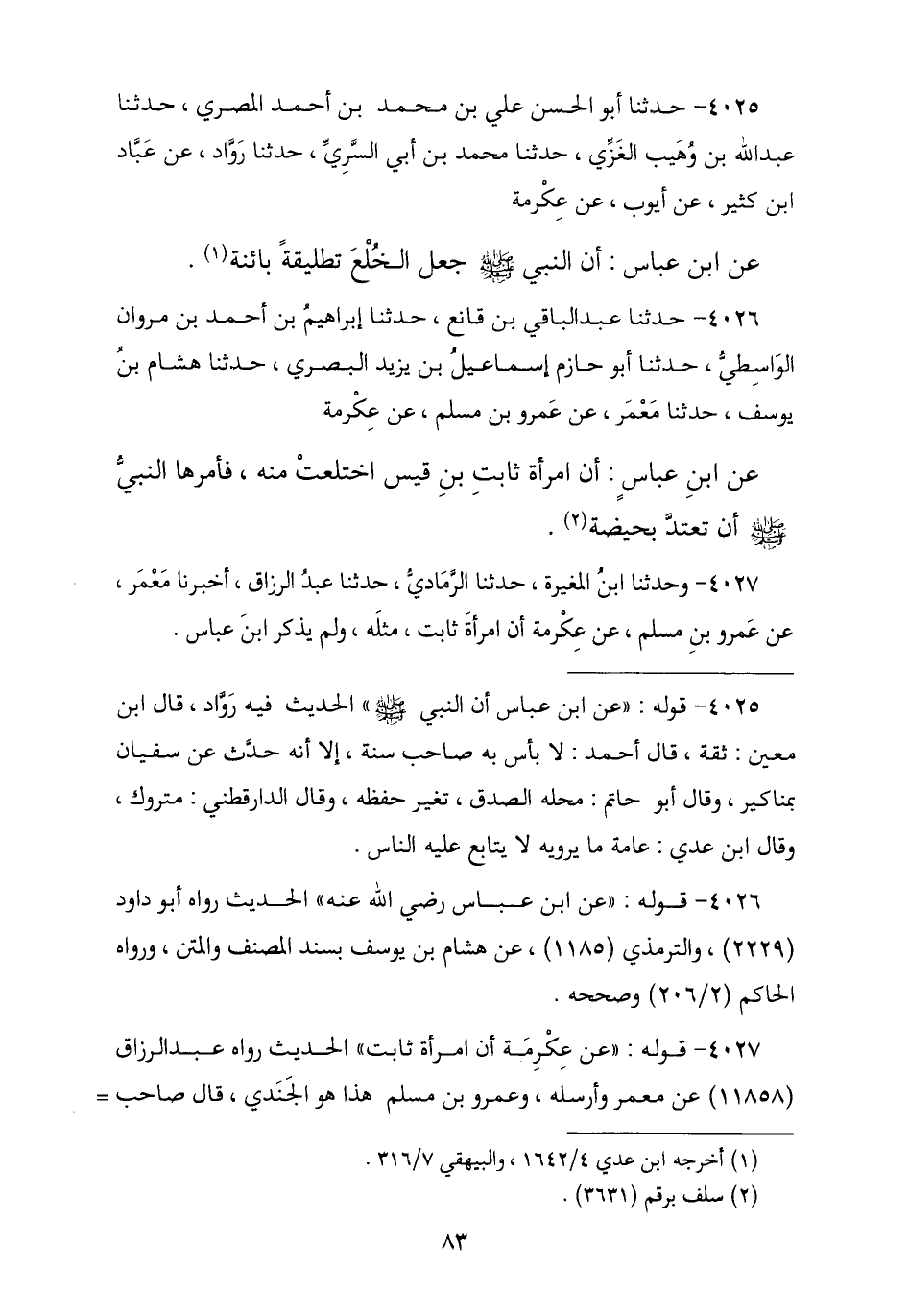 4025 - نا أَبُو الْحَسَنِ عَلِيُّ بْنُ مُحَمَّدِ بْنِ أَحْمَدَ الْمِصْرِيُّ , نا عَبْدُ اللَّهِ بْنُ وُهَيْبٍ الْغَزِّيُّ , نا مُحَمَّدُ بْنُ أَبِي السَّرِيِّ , نا رَوَّادُ بْنُ عَبَّادِ بْنِ كَثِيرٍ , عَنْ أَيُّوبَ , عَنْ عِكْرِمَةَ , عَنِ ابْنِ عَبَّاسٍ , أَنَّ النَّبِيَّ صَلَّى اللهُ عَلَيْهِ وَسَلَّمَ «جَعَلَ §الْخُلْعَ تَطْلِيقَةً بَائِنَةً»