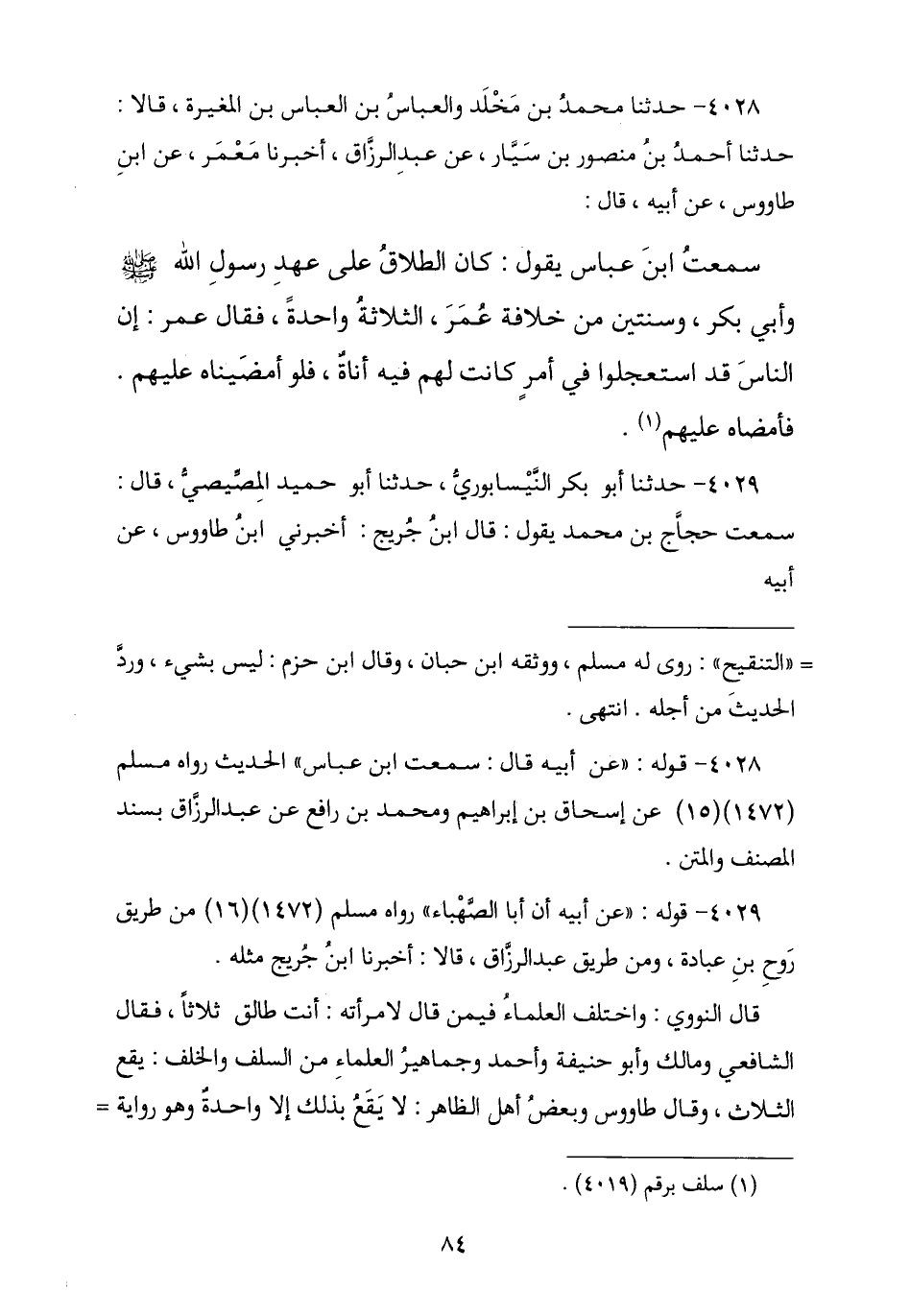 4028 - نا مُحَمَّدُ بْنُ مَخْلَدٍ , وَالْعَبَّاسُ بْنُ الْعَبَّاسِ بْنِ الْمُغِيرَةِ , قَالَا: نا أَحْمَدُ بْنُ مَنْصُورِ بْنِ سَيَّارٍ , عَنْ عَبْدِ الرَّزَّاقِ , أنا مَعْمَرٌ , عَنِ ابْنِ طَاوُسٍ , عَنْ أَبِيهِ , قَالَ: سَمِعْتُ ابْنَ عَبَّاسٍ , يَقُولُ: " كَانَ الطَّلَاقُ عَلَى عَهْدِ رَسُولِ اللَّهِ صَلَّى اللهُ عَلَيْهِ وَسَلَّمَ وَأَبِي بَكْرٍ وَسَنَتَيْنِ مِنْ خِلَافَةِ عُمَرَ: الثَّلَاثَةُ وَاحِدَةٌ , فَقَالَ عُمَرُ: إِنَّ النَّاسَ قَدِ §اسْتَعْجَلُوا فِي أَمْرٍ كَانَتْ لَهُمْ فِيهِ أَنَاةٌ فَلَوْ أَمْضَيْنَاهُ عَلَيْهِمْ فَأَمْضَاهُ عَلَيْهِمْ "