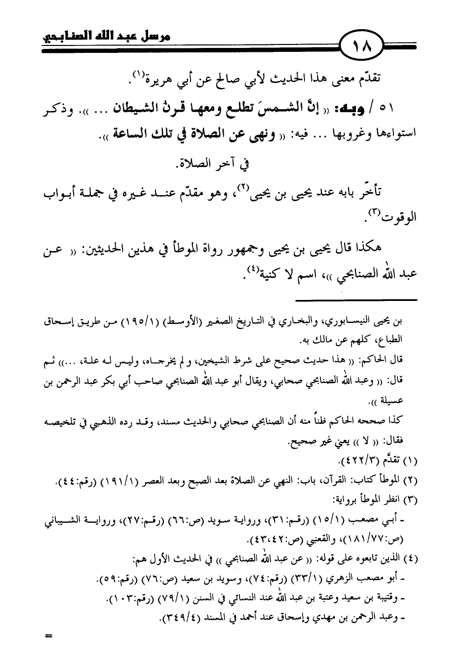 هكذا قال يحيى بن يحيى وجمهور رواة الموطأ في هذين الحديثين: "عن عبد الله الصنابحي"، اسم لا كنية (٤).
