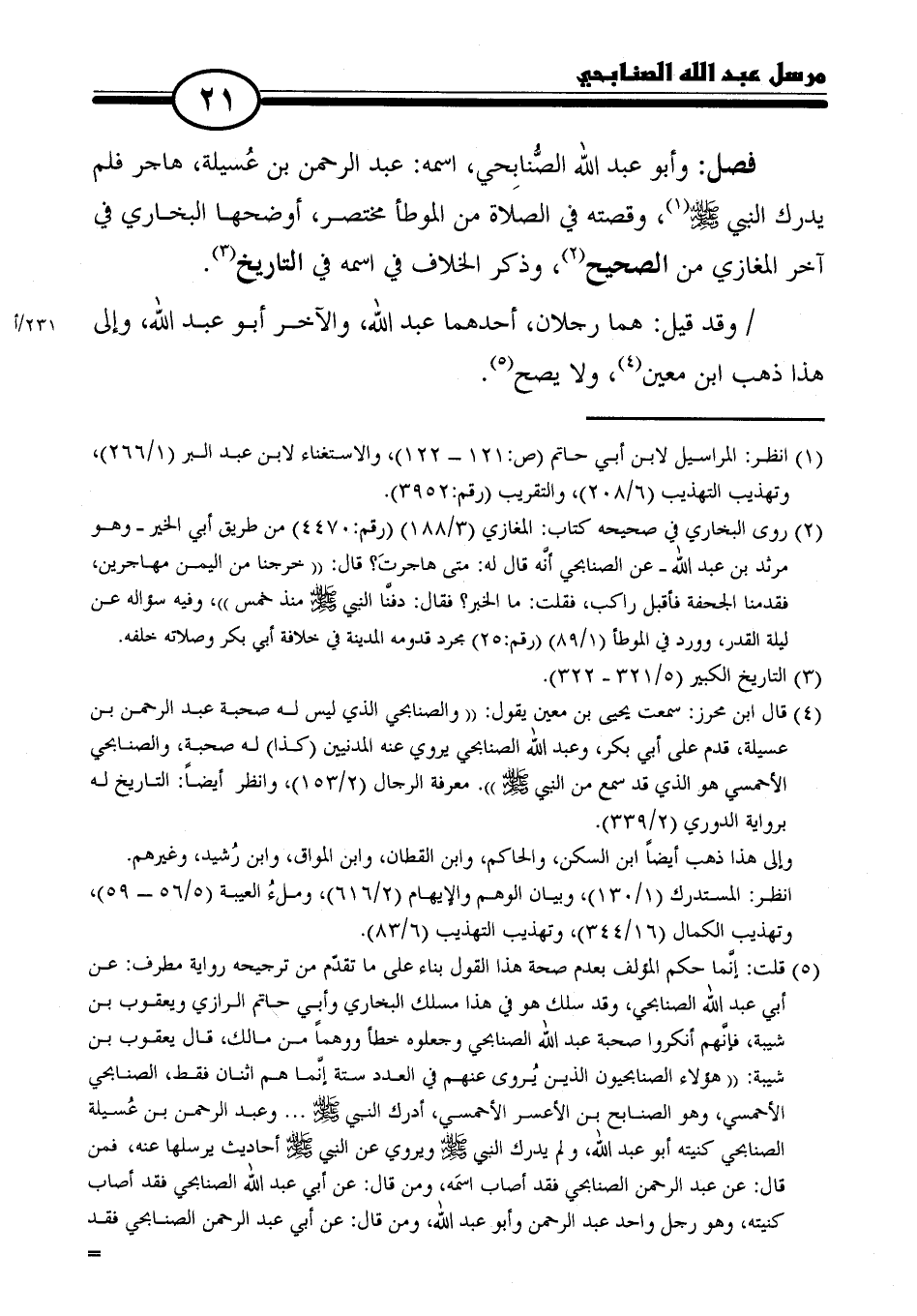 (٤) قال ابن محرز: سمعت يحيى بن معين يقول: "والصنابحي الذي ليس له صحبة عبد الرحمن بن عسيلة، قدم على أبي بكر، وعبد الله الصنابحي يروي عنه المدنيين (كذا) له صحبة، والصنابحي الأحمسي هو الذي قد سمع من النبي - صلى الله عليه وسلم -. معرفة الرجال (٢/ ١٥٣)، وانظر أيضًا: التاريخ له برواية الدوري (٢/ ٣٣٩).