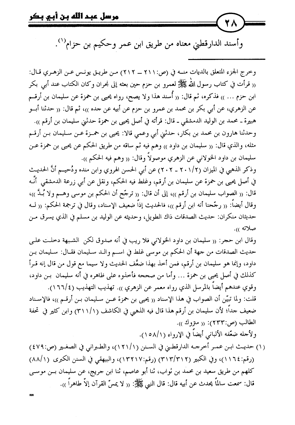 = وخرج الجزء المتعلق بالديات منه في (ص: ٢١١ - ٢١٢) من طريق يونس عن الزهري قال: "قرأت في كتاب رسول الله - صلى الله عليه وسلم - لعمرو بن حزم حين بعثه إلى نجران وكان الكتاب عند أبي بكر بن حزم. . ." فذكره، ثم قال: "أسند هذا ولا يصح، رواه يحيى بن حمزة عن سليمان بن أرقم عن الزهري، عن أبي بكر بن محمد بن عمرو بن حزم عن أبيه عن جده"، ثم قال: "حدثنا أبو هبيرة -محمد بن الوليد الدمشقي- قال: قرأته في أصل يحيى بن حمزة حدثني سليمان بن أرقم". وحدثنا هارون بن محمد بن بكار، حدثني أبي وعمي قالا: يحيى بن حمزة عن سليمان بن أرقم مثله، والذي قال: "سليمان بن داود" وهم فيه ثم ساقه من طريق الحكم عن يحيى بن حمزة عن سليمان بن داود الخولاني عن الزهري موصولًا وقال: "وهم فيه الحكم".