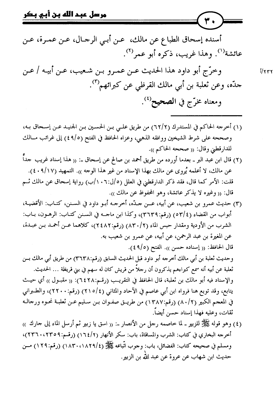 وخرّج أبو داود هذا الحديث عن عمرو بن شعيب، عن أبيه عن جدّه، وعن ثعلبة بن أبي مالك القرظي عن كبرائهم (٣).
