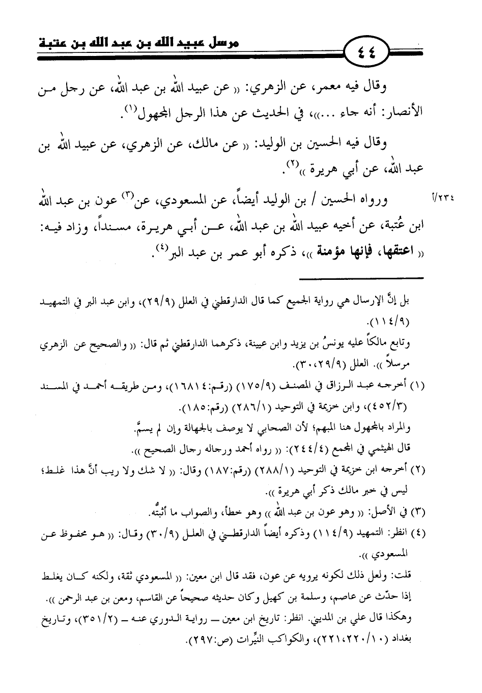 ورواه الحسين بن الوليد أيضًا، عن المسعودي، عن (٣) عون بن عبد الله بن عُتبة، عن أخيه عبيد الله بن عبد الله، عن أبي هريرة، مسندًا، وزاد فيه: "أعتقها، فإنها مؤمنة"، ذكره أبو عمر بن عبد البر (٤).