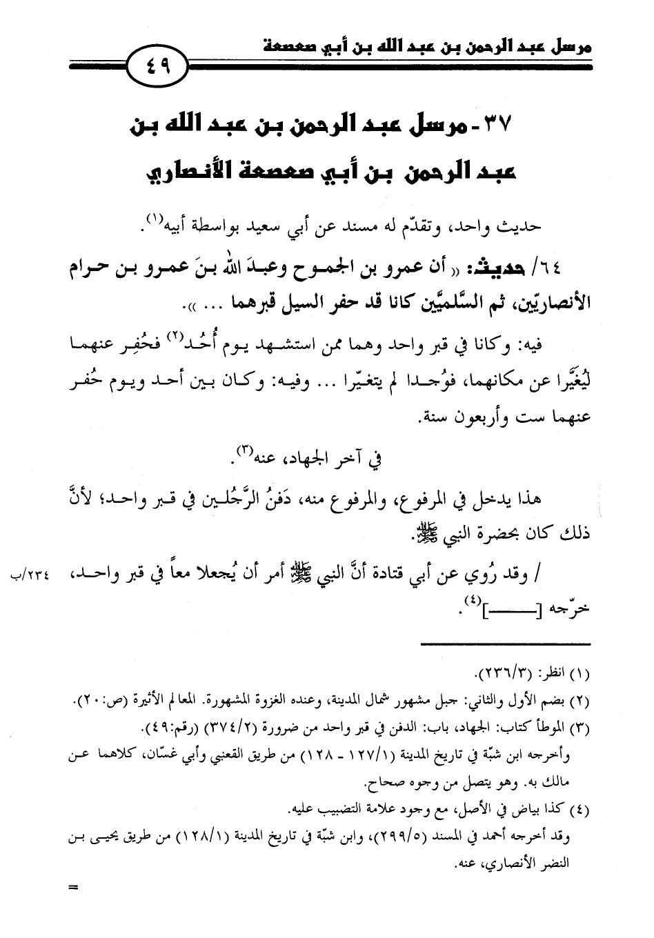 ٦٤ / حديث: "أن عمرو بن الجموح وعبدَ الله بنَ عمرو بن حرام الأنصاريّين، ثم السَّلميَّين كانا قد حفر السيل قبرهما. . .".