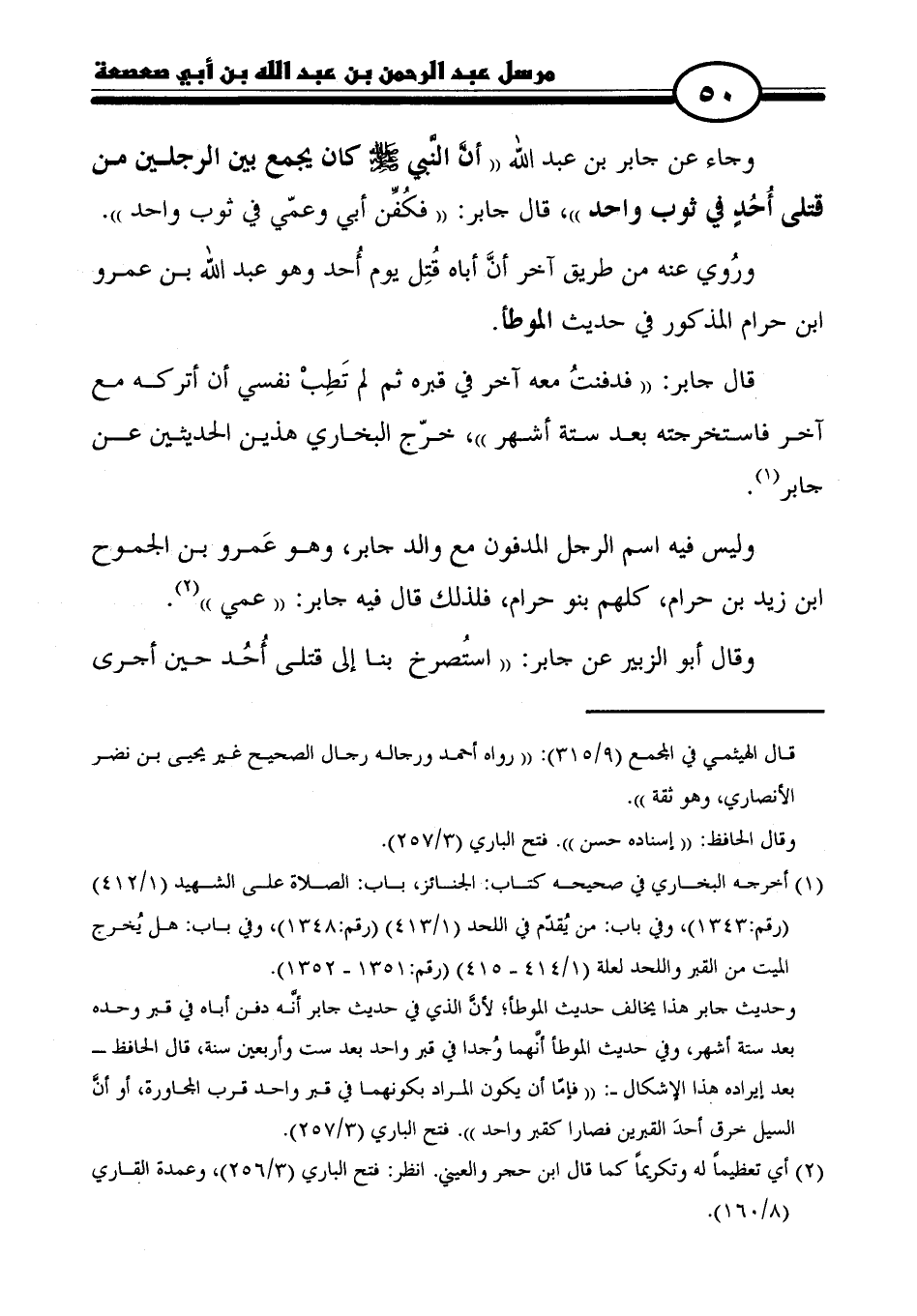 وليس فيه اسم الرجل المدفون مع والد جابر، وهو عَمرو بن الجموح بن زيد بن حرام، كلهم بنو حرام، فلذلك قال فيه جابر: "عمي" (٢).